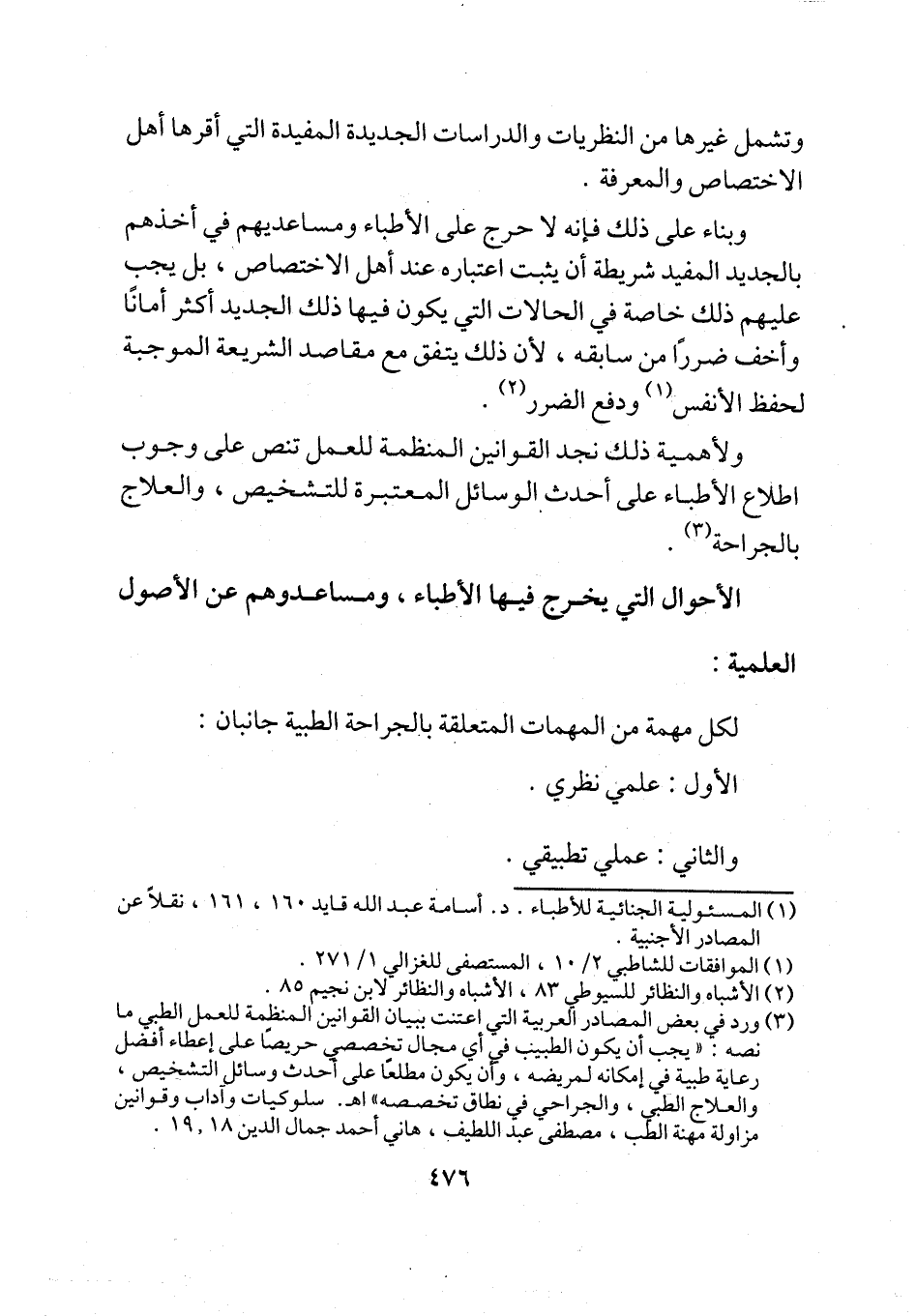 (¬3) ورد في بعض المصادر العربية التى اعتنت ببيان القوانين المنظمة للعمل الطبي ما نصه: "يجب أن يكون الطبيب في أي مجال تخصصى حريصًا على إعطاء أفضل رعاية طبية في إمكانه لمريضه، وآن يكون مطلعًا على أحدث وسائل التشخيص، والعلاج الطبي، والجراحي في نطاق تخصصه" اهـ. سلوكيات وآداب وقوانين مزاولة مهنة الطب، مصطفى عبد اللطيف، هاني أحمد جمال الدين 18, 19.