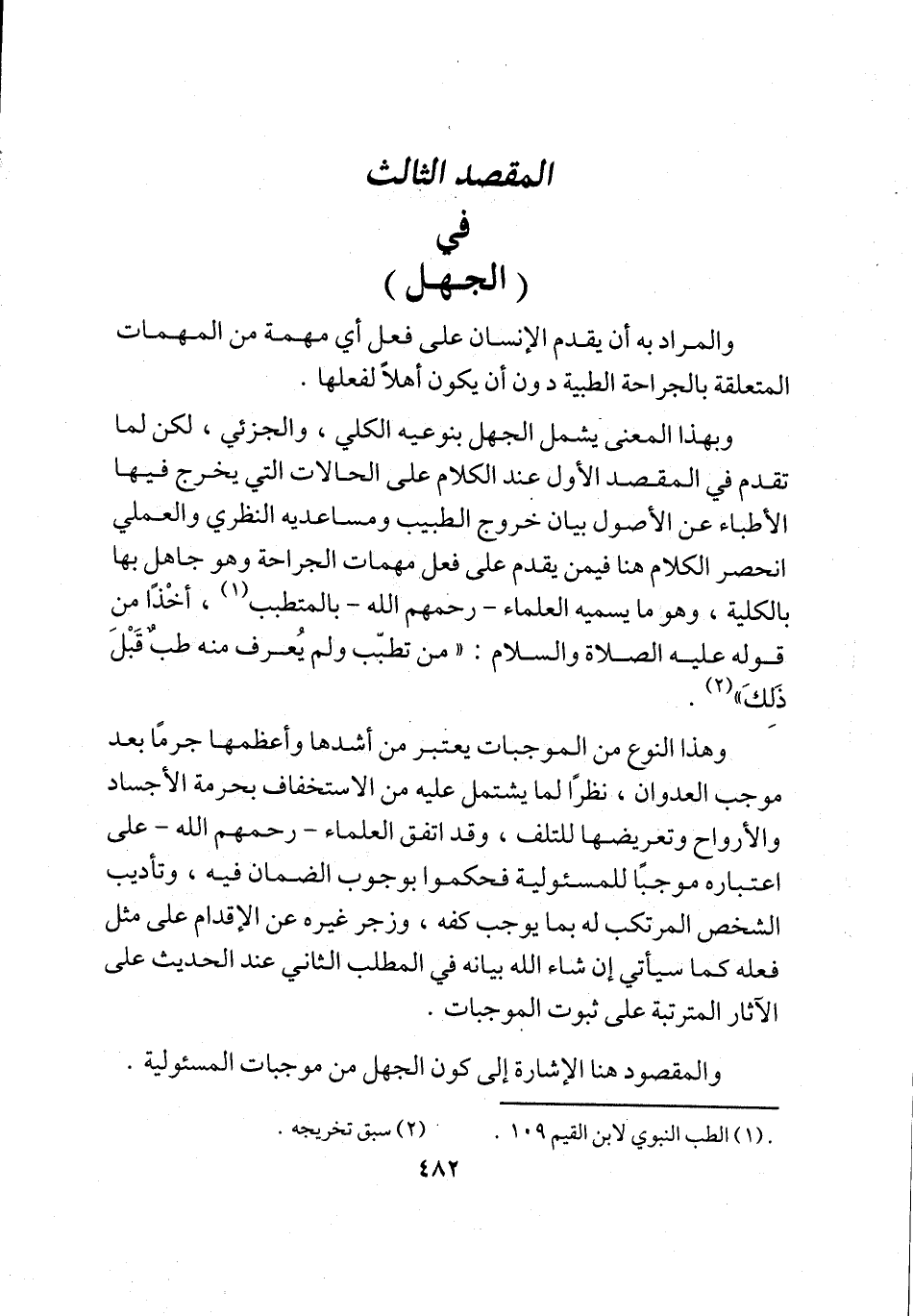 وبهذا المعنى يشمل الجهل بنوعيه الكلي، والجزئي، لكن لما تقدم في المقصد الأول عند الكلام على الحالات التي يخرج فيها الأطباء عن الأصول بيان خروج الطبيب ومساعديه النظري والعملي انحصر الكلام هنا فيمن يقدم على فعل مهمات الجراحة وهو جاهل بها بالكلية، وهو ما يسميه العلماء -رحمهم الله- بالمتطبب (¬1)، أخذًا من قوله عليه الصلاة والسلام: "من تطبّب ولم يُعرف منه طبٌ قَبْلَ ذَلكَ" (¬2).