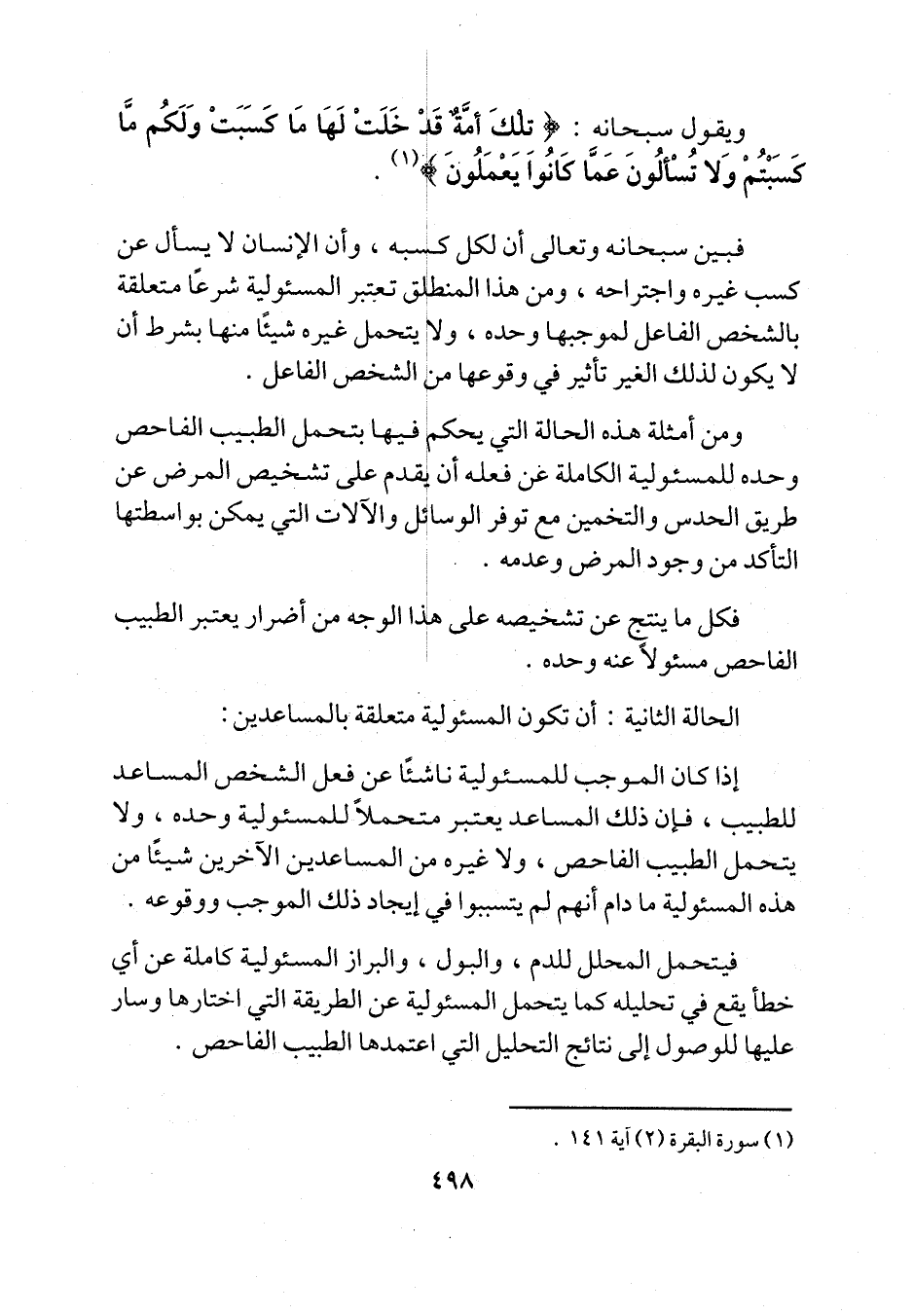 فكل ما ينتج عن تشخيصه على هذا الوجه من أضرار يعتبر الطبيب الفاحص مسئولاً عنه وحده.