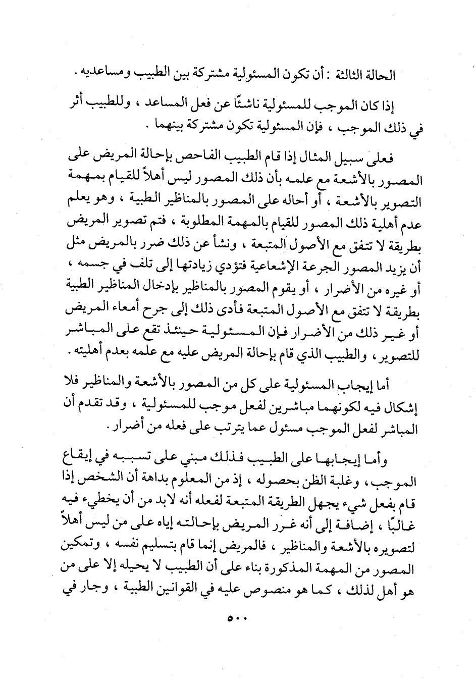 وأما إيجابها على الطبيب فذلك مبني على تسببه في إيقاع الموجب، وغلبة الظن بحصوله، إذ من المعلوم بداهة أن الشخص إذا قام بفعل شيء يجهل الطريقة المتبعة لفعله أنه لابد من أن يخطيء فيه غالبًا، إضافة إلى أنه غرر المريض بإحالته إياه على من ليس أهلاً لتصويره بالأشعة والمناظير، فالمريض إنما قام بتسليم نفسه، وتمكين المصور من المهمة المذكورة بناء على أن الطبيب لا يحيله إلا على من هو أهل لذلك، كما هو منصوص عليه في القوانين الطبية، وجار في