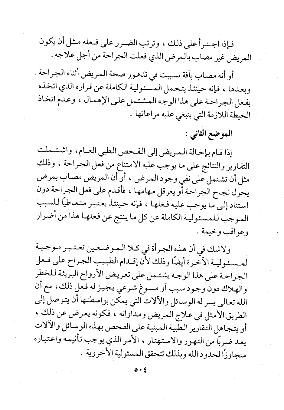أو أنه مصاب بآفة تسببت في تدهور صحة المريض أثناء الجراحة وبعدها، فإنه حينئذ يتحمل المسئولية الكاملة عن قراره الذي اتخذه بفعل الجراحة على هذا الوجه المشتمل على الإهمال، وعدم اتخاذ الحيطة اللازمة التي ينبغي عليه مراعاتها.