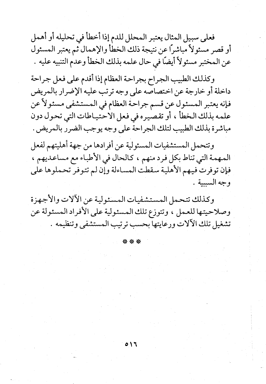 وكذلك الطبيب الجراح بجراحة العظام إذا أقدم على فعل جراحة داخلة أو خارجة عن اختصاصه على وجه ترتب عليه الإضرار بالمريض فإنه يعتبر المسئول عن قسم جراحة العظام في المستشفى مسئولاً عن علمه بذلك الخطأ، أو تقصيره في فعل الاحتياطات التي تحول دون مباشرة بذلك الطبيب لتلك الجراحة على وجه يوجب الضرر بالمريض.