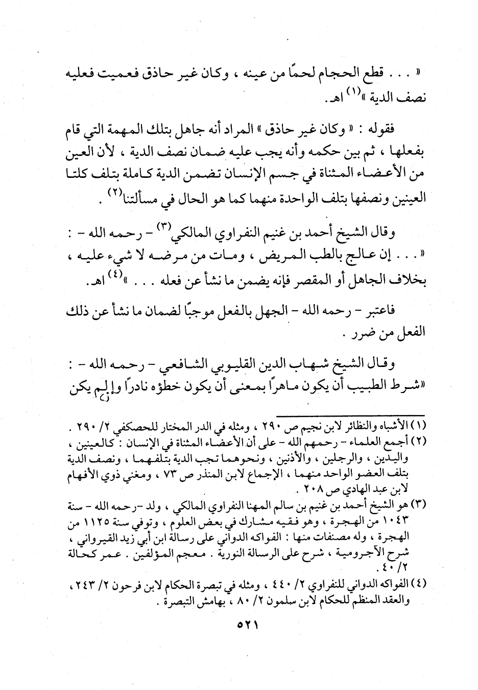 وقال الشيخ أحمد بن غنيم النفراوي المالكي (¬3) -رحمه الله-: " ... إن عالج بالطب المريض، ومات من مرضه لا شيء عليه، بخلاف الجاهل أو المقصر فإنه يضمن ما نشأ عن فعله ... " (¬4) اهـ.