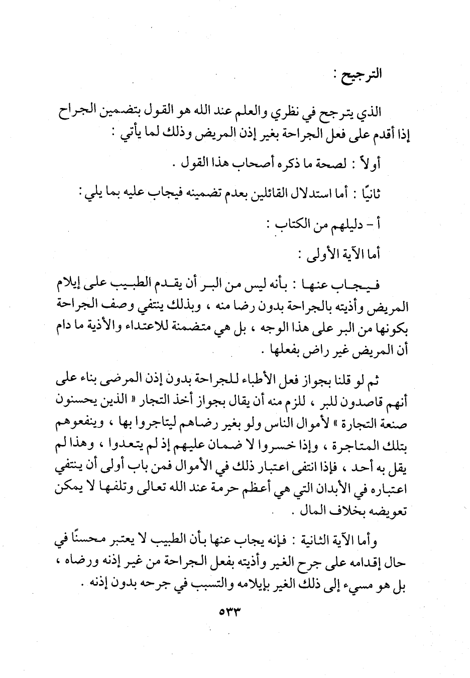 وأما الآية الثانية: فإنه يجاب عنها بأن الطبيب لا يعتبر محسنًا في حال إقدامه على جرح الغير وأذيته بفعل الجراحة من غير إذنه ورضاه، بل هو مسيء إلى ذلك الغير بإيلامه والتسبب في جرحه بدون إذنه.