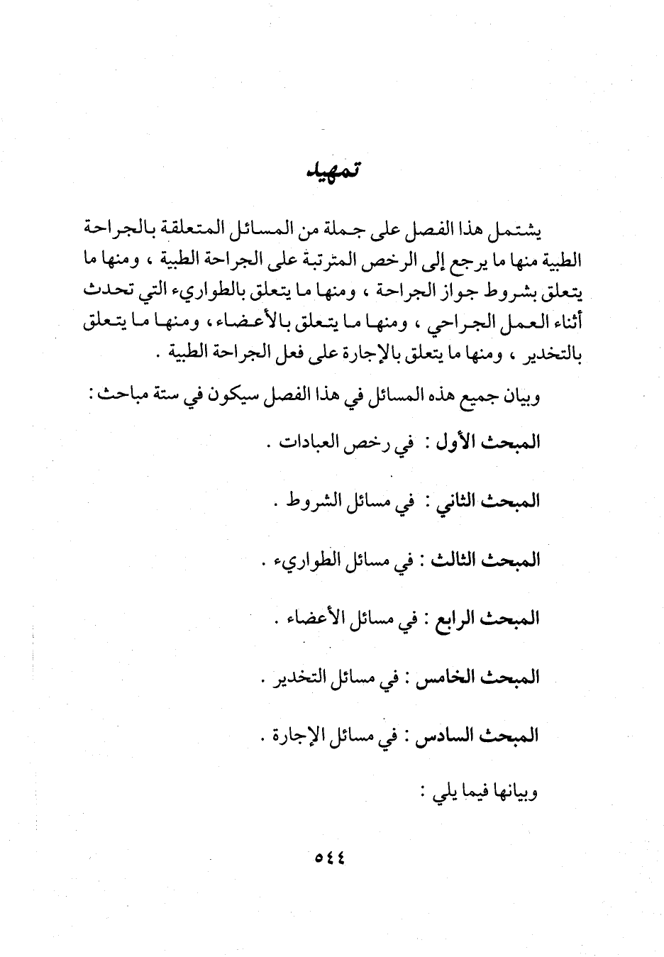 يشتمل هذا الفصل على جملة من المسائل المتعلقة بالجراحة الطبية منها ما يرجع إلى الرخص المترتبة على الجراحة الطبية، ومنها ما يتعلق بشروط جواز الجراحة، ومنها ما يتعلق بالطواريء التي تحدث أثناء العمل الجراحي، ومنها ما يتعلق بالأعضاء، ومنها ما يتعلق بالتخدير، ومنها ما يتعلق بالإجارة على فعل الجراحة الطبية.