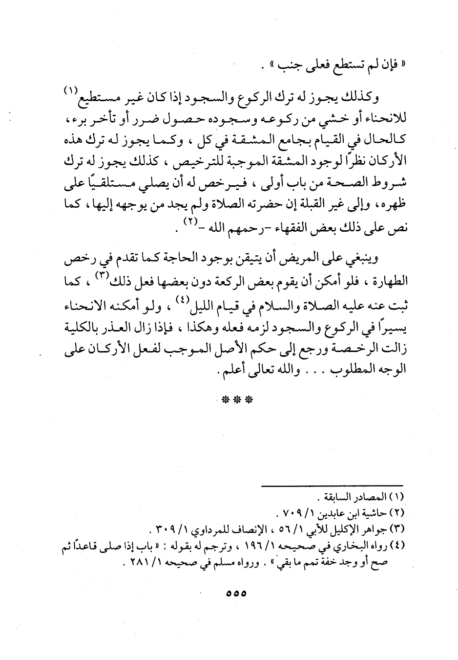 وينبغي على المريض أن يتيقن بوجود الحاجة كما تقدم في رخص الطهارة، فلو أمكن أن يقوم بعض الركعة دون بعضها فعل ذلك (¬3)، كما ثبت عنه عليه الصلاة والسلام في قيام الليل (¬4)، ولو أمكنه الانحناء يسيرًا في الركوع والسجود لزمه فعله وهكذا، فإذا زال العذر بالكلية زالت الرخصة ورجع إلى حكم الأصل الموجب لفعل الأركان على الوجه المطلوب ... والله تعالى أعلم.