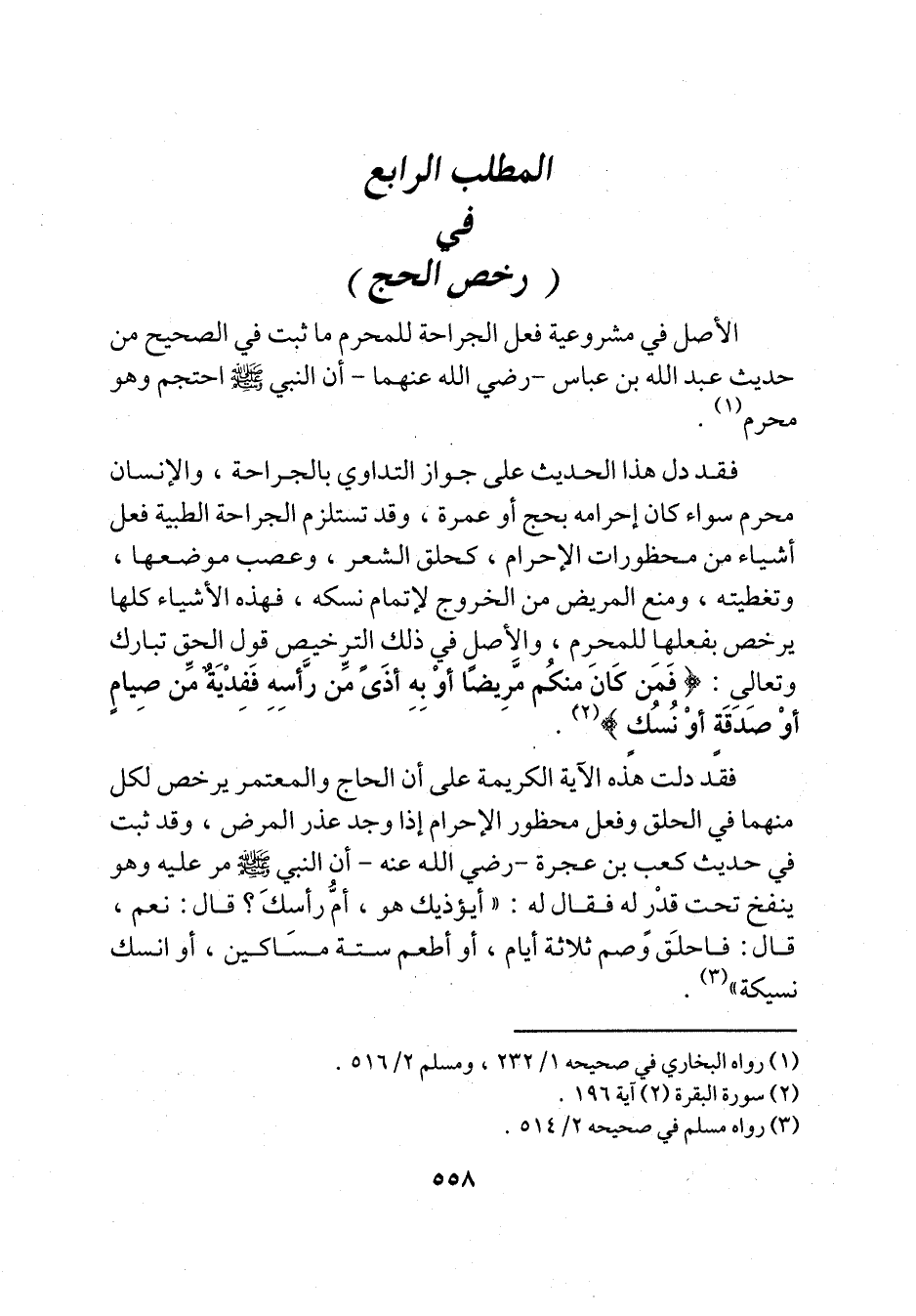 فقد دلت هذه الآية الكريمة على أن الحاج والمعتمر يرخص لكل منهما في الحلق وفعل محظور الإحرام إذا وجد عذر المرض، وقد ثبت في حديث كعب بن عجرة -رضي الله عنه- أن النبي - صلى الله عليه وسلم - مر عليه وهو ينفخ تحت قدْرٍ له فقال له: "أيؤذيك هو، أمُّ رأسكَ؟ قال: نعم، قال: فاحلَق وصم ثلاثة أيام، أو أطعم ستة مساكين، أو انسك نسيكة" (¬3).