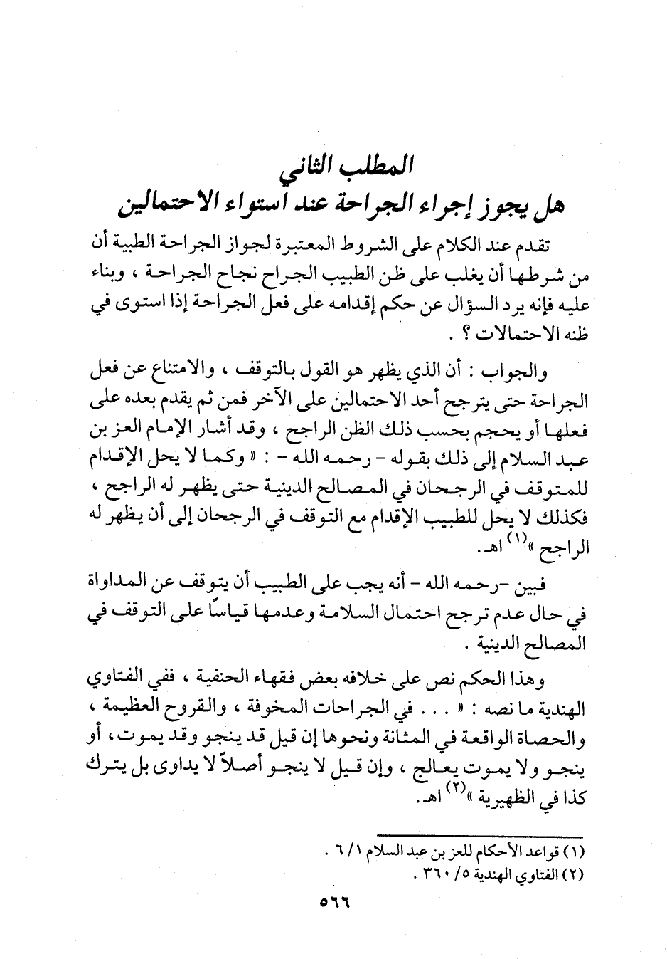 والجواب: أن الذي يظهر هو القول بالتوقف، والامتناع عن فعل الجراحة حتى يترجح أحد الاحتمالين على الآخر فمن ثم يقدم بعده على فعلها أو يحجم بحسب ذلك الظن الراجح، وقد أشار الإمام العز بن عبد السلام إلى ذلك بقوله -رحمه الله-: "وكما لا يحل الإقدام للمتوقف في الرجحان في المصالح الدينية حتى يظهر له الراجع، فكذلك لا يحل للطبيب الإقدام مع التوقف في الرجحان إلى أن يظهر له الراجح" (¬1) اهـ.