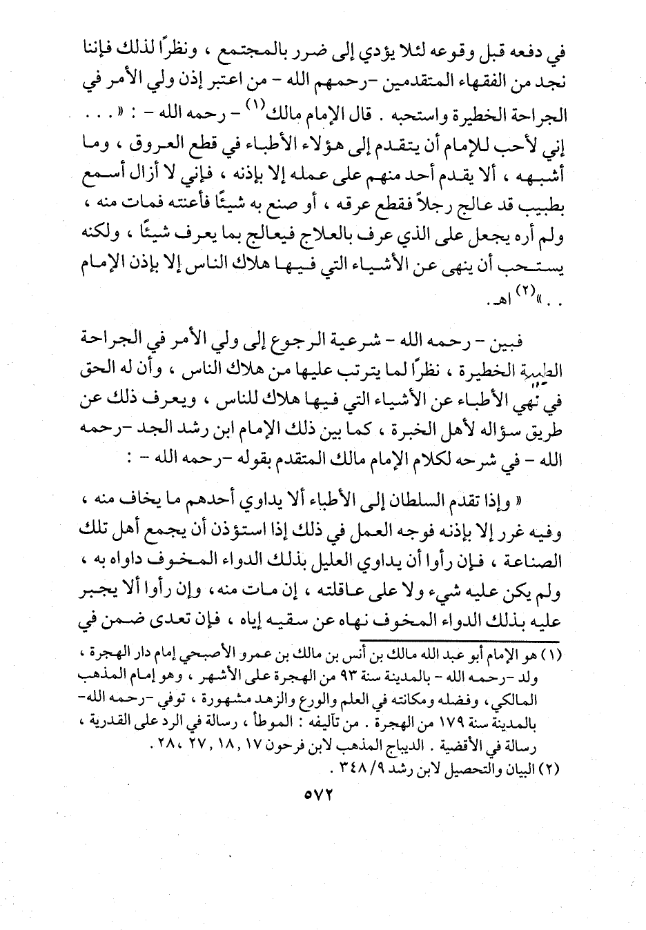 فبين -رحمه الله- شرعية الرجوع إلى ولي الأمر في الجراحة الطبية الخطيرة، نظرًا لما يترتب عليها من هلاك الناس، وأن له الحق في نهي الأطباء عن الأشياء التي فيها هلاك للناس، ويعرف ذلك عن طريق سؤاله لأهل الخبرة، كما بين ذلك الإمام ابن رشد الجد -رحمه الله- في شرحه لكلام الإمام مالك المتقدم بقوله -رحمه الله-: