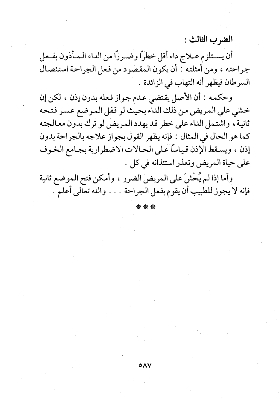 وحكمه: أن الأصل يقتضي عدم جواز فعله بدون إذن، لكن إن خشي على المريض من ذلك الداء بحيث لو قفل الموضع عسر فتحه ثانية، واشتمل الداء على خطر قد يهدد المريض لو ترك بدون معالجته كما هو الحال في المثال: فإنه يظهر القول بجواز علاجه بالجراحة بدون إذن، ويسقط الإذن قياسًا على الحالات الاضطرارية بجامع الخوف على حياة المريض وتعذر استئذانه في كل.
