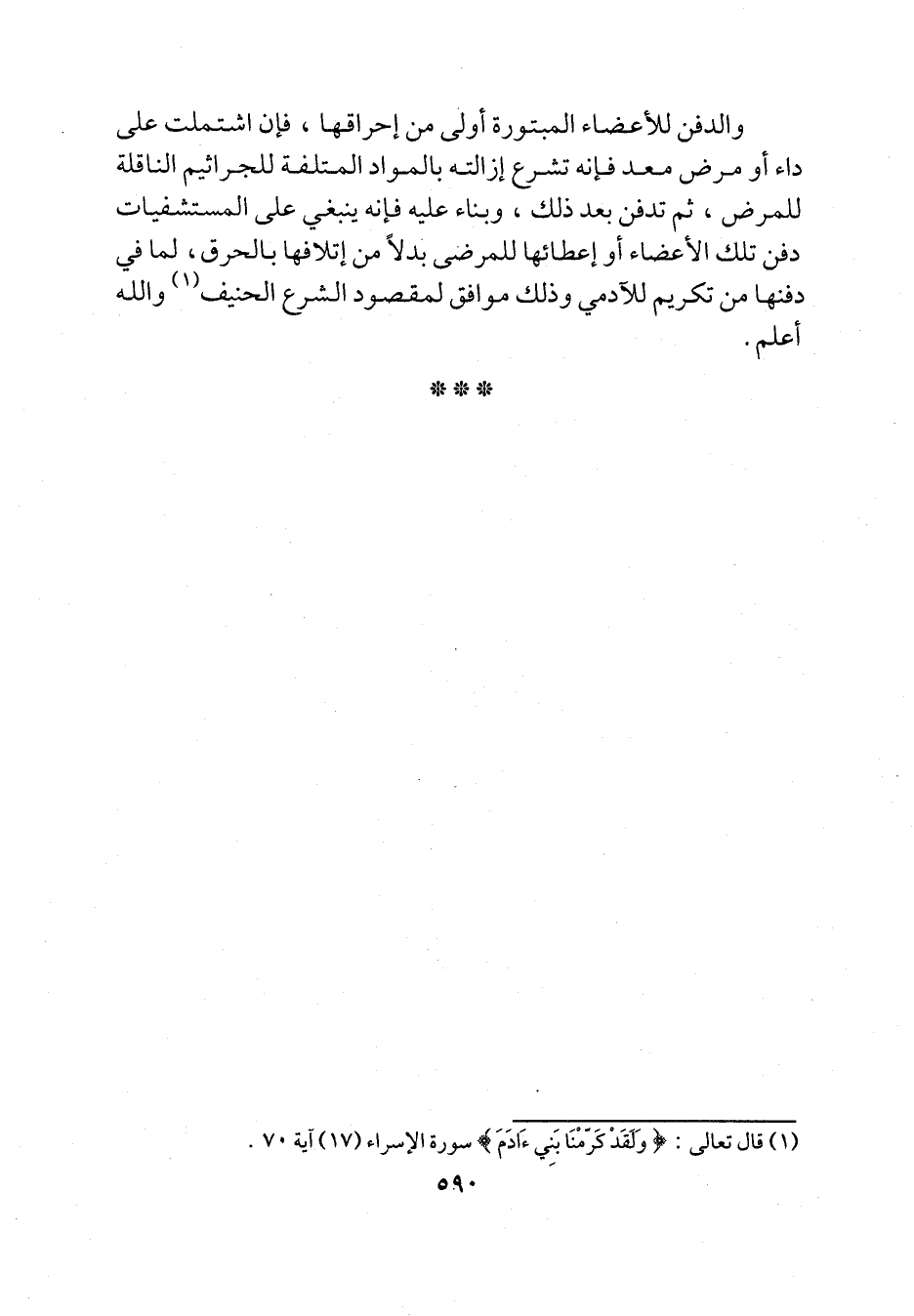 والدفن للأعضاء المبتورة أولى من إحراقها، فإن اشتملت على داء أو مرض معد فإنه تشرع إزالته بالمواد المتلفة للجراثيم الناقلة للمرض، ثم تدفن بعد ذلك، وبناء عليه فإنه ينبغي على المستشفيات دفن تلك الأعضاء أو إعطائها للمرضى بدلاً من إتلافها بالحرق، لما في دفنها من تكريم للآدمي وذلك موافق لمقصود الشرع الحنيف (¬1) والله أعلم.