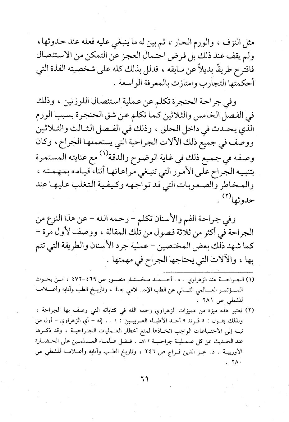 (¬2) تعتبر هذه ميزة من مميزات الزهراوي رحمه الله في كتاباته التي وصف بها الجراحة، ولذلك يقول: "فرند" أحد الأطباء الغربيين: " .. إنه -أي الزهراوي- أول من نبه إلى الاحتياطات الواجب اتخاذها لمنع أخطار العمليات الجراحية، وقد ذكرها عند الحديث عن كل عملية جراحية" اهـ. فضل علماء المسلمين على الحضارة الاوربية. د. عز الدين فراج ص 246، وتاريخ الطب وآدابه وأعلامه للشطي ص280.