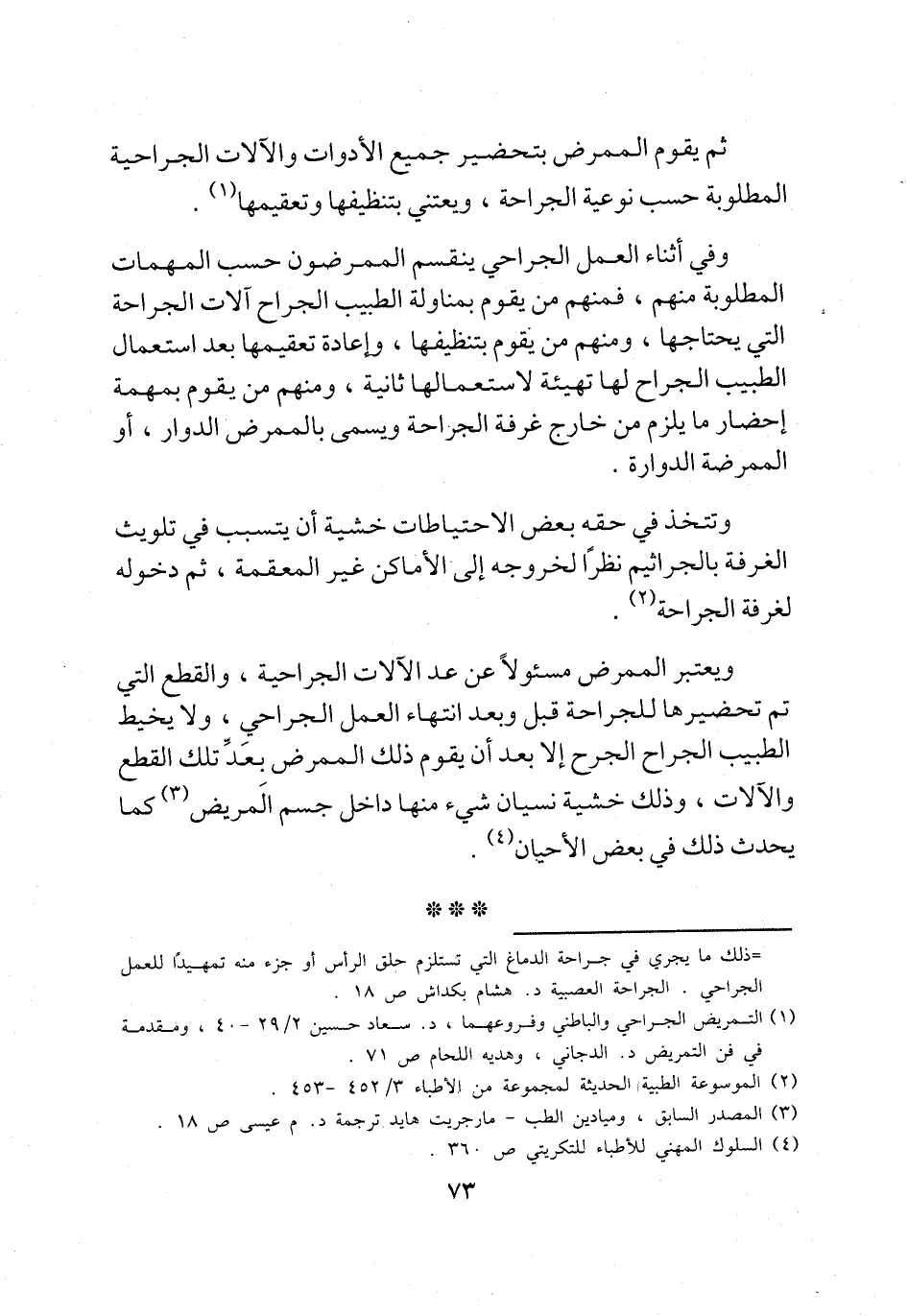 ويعتبر الممرض مسئولاً عن عد الآلات الجراحية، والقطع التي تم تحضيرها للجراحة قبل وبعد انتهاء العمل الجراحي، ولا يخيط الطبيب الجراح الجرح إلا بعد أن يقوم ذلك الممرض بِعَدِّ تلك القطع والآلات، وذلك خشية نسيان شيء منها داخل جسم المريض (¬3) كما يحدث ذلك في بعض الأحيان (¬4).