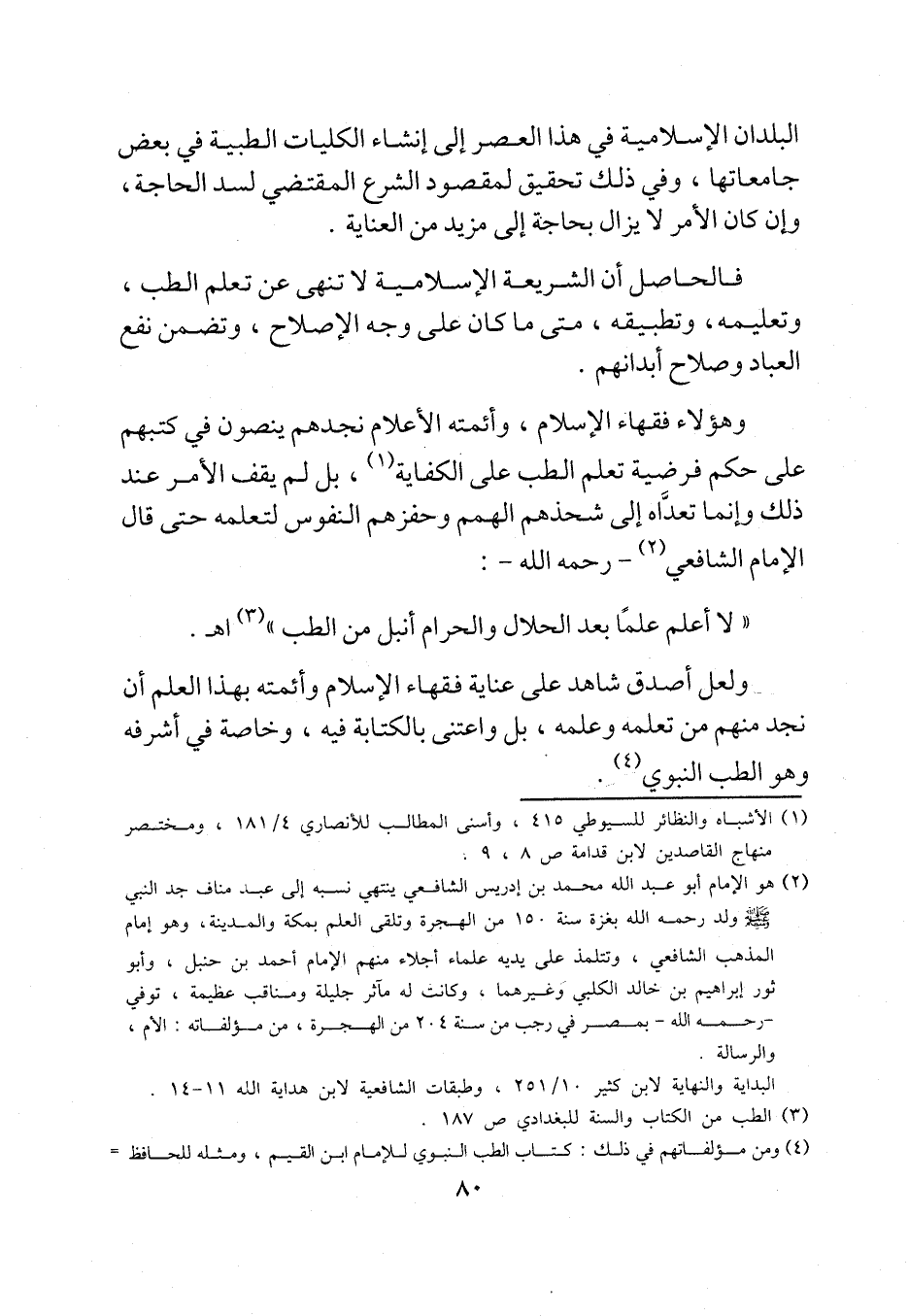 وهؤلاء فقهاء الإسلام، وأئمته الأعلام نجدهم ينصون في كتبهم على حكم فرضية تعلم الطب على الكفاية (¬1)، بل لم يقف الأمر عند ذلك وإنما تعدَّاه إلى شحذهم الهمم وحفزهم النفوس لتعلمه حتى قال الإمام الشافعي (¬2) -رحمه الله-: