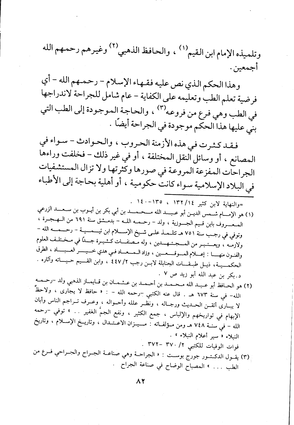 وهذا الحكم الذي نص عليه فقهاء الإسلام -رحمهم الله- أي فرضية تعلم الطب وتعليمه على الكفاية- عام شامل للجراحة لاندراجها في الطب وهي فرع من فروعه (¬3)، والحاجة الموجودة إلى الطب التي بني عليها هذا الحكم موجودة في الجراحة أيضًا.