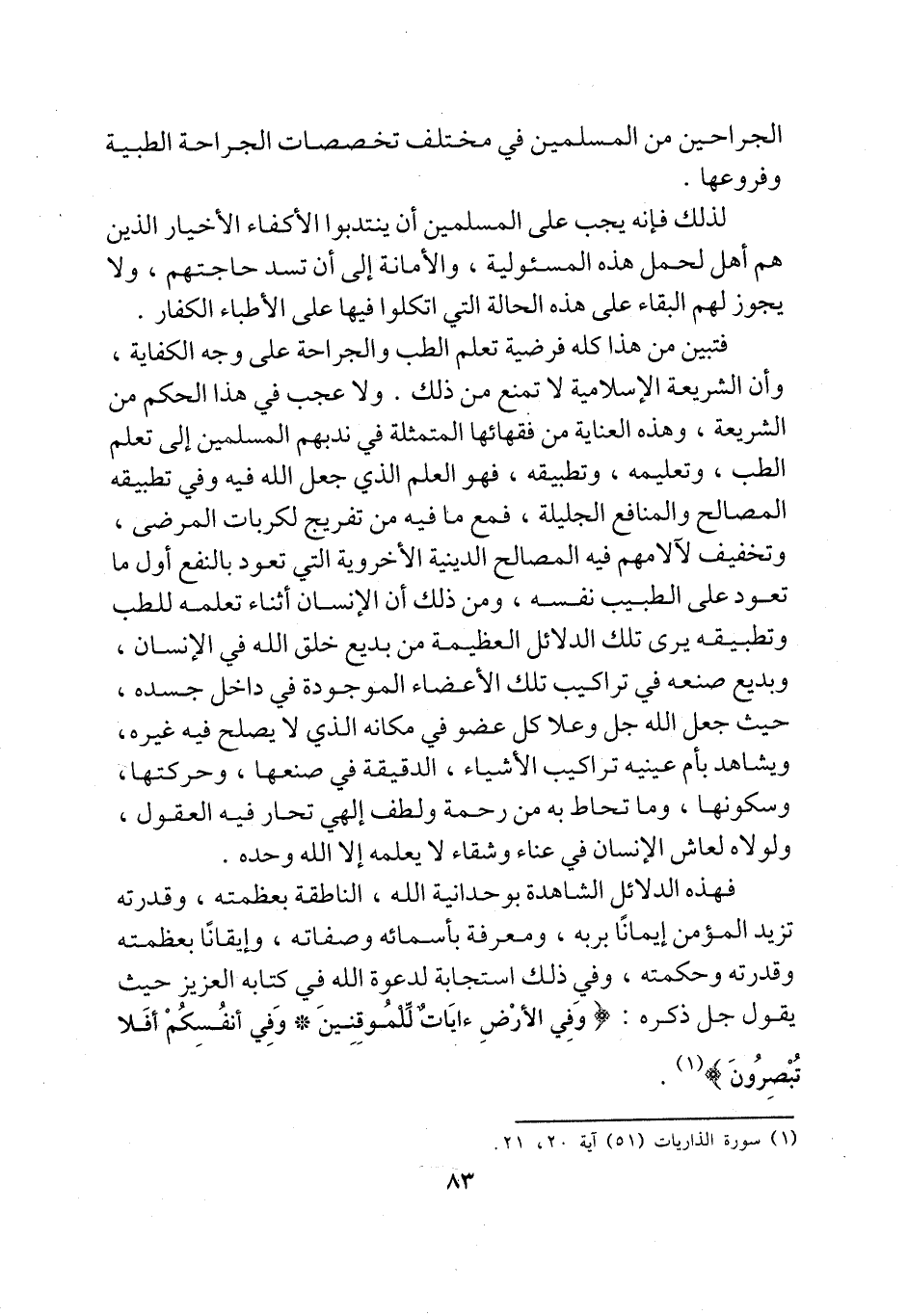 فتبين من هذا كله فرضية تعلم الطب والجراحة على وجه الكفاية، وأن الشريعة الإسلامية لا تمنع من ذلك. ولا عجب في هذا الحكم من الشريعة، وهذه العناية من فقهائها المتمثلة في ندبهم المسلمين إلى تعلم الطب، وتعليمه، وتطبيقه، فهو العلم الذي جعل الله فيه وفي تطبيقه المصالح والمنافع الجليلة، فمع ما فيه من تفريج لكربات المرضى، وتخفيف لآلامهم فيه المصالح الدينية الأخروية التي تعود بالنفع أول ما تعود على الطبيب نفسه، ومن ذلك أن الإنسان أثناء تعلمه للطب وتطبيقه يرى تلك الدلائل العظيمة من بديع خلق الله في الإنسان، وبديع صنعه في تراكيب تلك الأعضاء الموجودة في داخل جسده، حيث جعل الله جل وعلا كل عضو في مكانه الذي لا يصلح فيه غيره، ويشاهد بأم عينيه تراكيب الأشياء، الدقيقة في صنعها، وحركتها، وسكونها، وما تحاط به من رحمة ولطف إلهي تحار فيه العقول، ولولاه لعاش الإنسان في عناء وشقاء لا يعلمه إلا الله وحده.