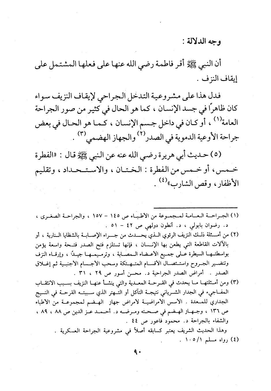 فدل هذا على مشروعية التدخل الجراحي لإيقاف النزيف سواء كان ظاهرًا في جسد الإنسان، كما هو الحال في كثير من صور الجراحة العامة (¬1)، أو كان في داخل جسم الإنسان، كما هو الحال في بعض جراحة الأوعية الدموية في الصدر (¬2) والجهاز الهضمي (¬3).