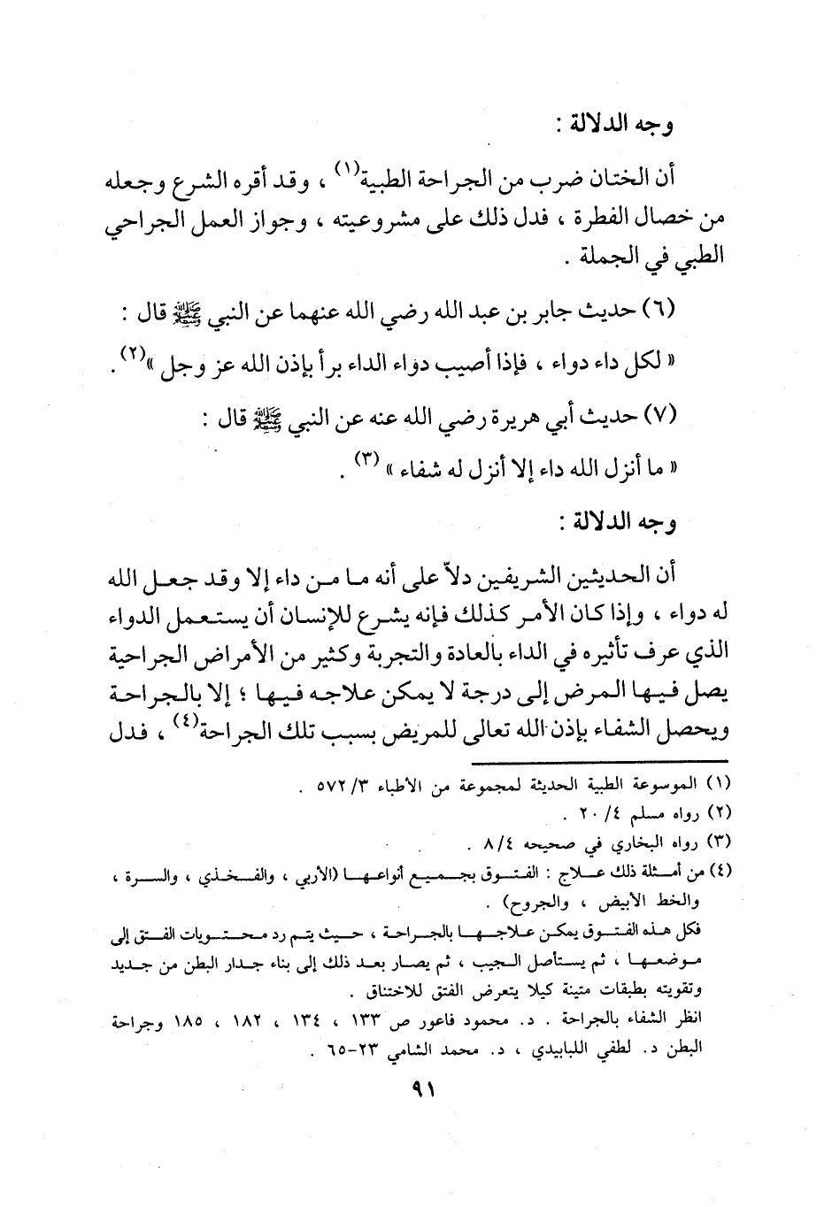 أن الحديثين الشريفين دلاّ على أنه ما من داء إلا وقد جعل الله له دواء، وإذا كان الأمر كذلك فإنه يشرع للإنسان أن يستعمل الدواء الذي عرف تأثيره في الداء بالعادة والتجربة وكثير من الأمراض الجراحية يصل فيها المرض إلى درجة لا يمكن علاجه فيها؛ إلا بالجراحة ويحصل الشفاء بإذن الله تعالى للمريض بسبب تلك الجراحة (¬4)، فدل