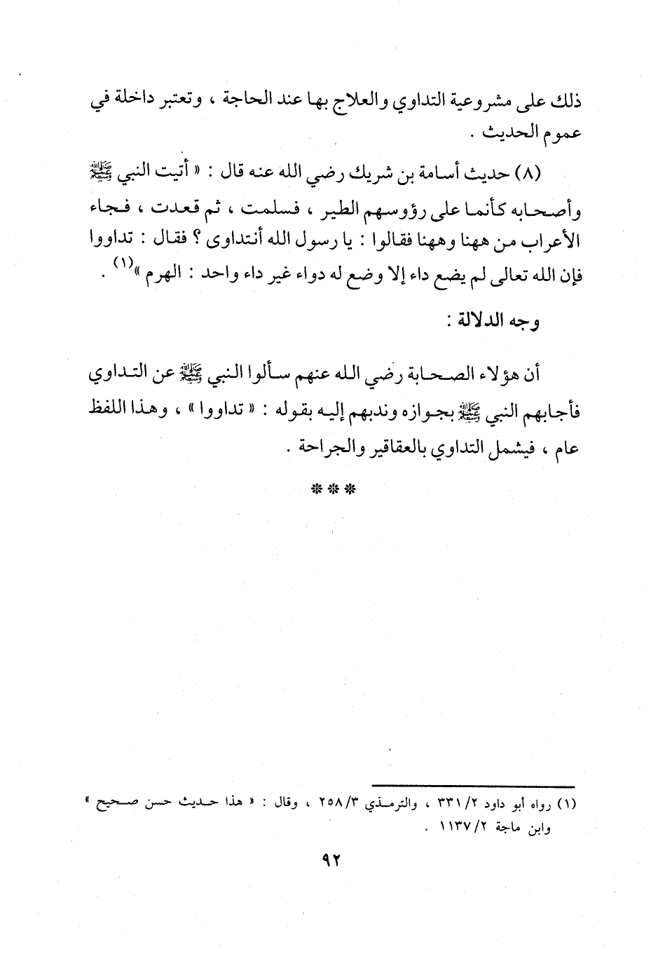 (8) حديث أسامة بن شريك رضي الله عنه قال: "أتيت النبي - صلى الله عليه وسلم - وأصحابه كأنما على رؤوسهم الطير، فسلمت، ثم قعدت، فجاء الأعراب من ههنا وههنا فقالوا: يا رسول الله أنتداوى؟ فقال: تداووا فإن الله تعالى لم يضع داء إلا وضع له دواء غير داء واحد: الهرم" (¬1).