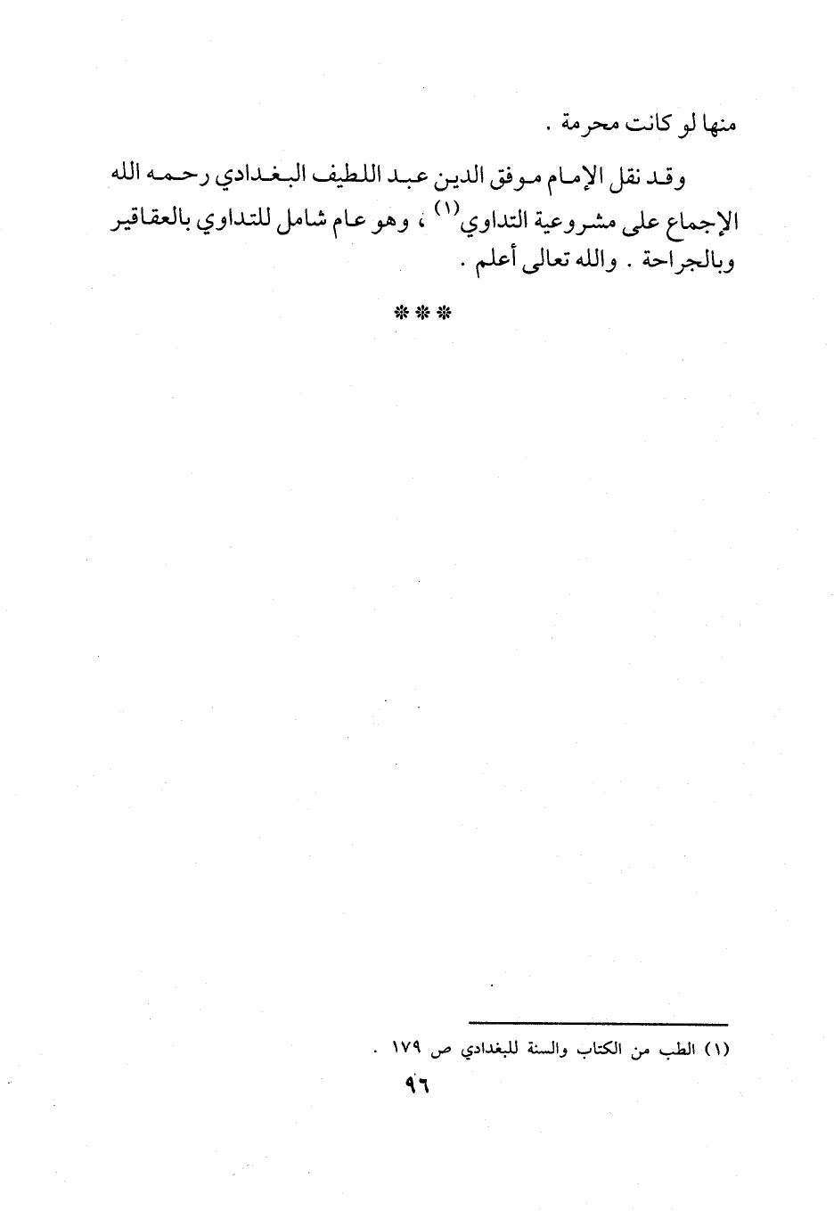 وقد نقل الإمام موفق الدين عبد اللطيف البغدادي رحمه الله الإجماع على مشروعية التداوي (¬1)، وهو عام شامل للتداوي بالعقاقير وبالجراحة. والله تعالى أعلم.