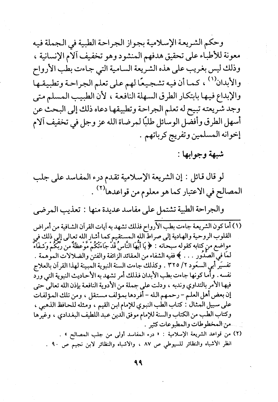 (¬1) أما كون الشريعة جاءت بطب الأرواح فذلك تشهد به آيات القرآن الشافية من أمراض القلوب الروحية والهادية إلى صراط الله المستقيم كما أشار الله تعالى إلى ذلك في مواضع من كتابه كقوله سبحانه: {يَا أيُّهَا النَاسُ قَدْ جَاءَتْكُمْ مَوْعظةٌ من ربَّكُمْ وَشفَاءٌ لماَ في الصُّدُور ... } ففيه الشفاء من العقائد الزائفة والفتن والضلالات الموهمة. تفسير أبي السعود 2/ 325. وكذلك جاءت السنة النبوية المبينة لهذا القرآن بالعلاج نفسه. وأما كونها جاءت بطب الأبدان فذلك أمر تشهد به الأحاديث النبوية التي ورد فيها الأمر بالتداوي وندبه، ودلت على جملة من الأدوية النافعة بإذن الله تعالى حتى إن بعض أهل العلم -رحمهم الله- أفردها بمؤلف مستقل، ومن تلك المؤلفات على سبيل المثال: كتاب الطب النبوي للإمام ابن القيم، ومثله للحافظ الذهبي، وكتاب الطب من الكتاب والسنة للإمام موفق الدين عبد اللطيف البغدادي، وغيرها من المخطوطات والمطبوعات كثير.