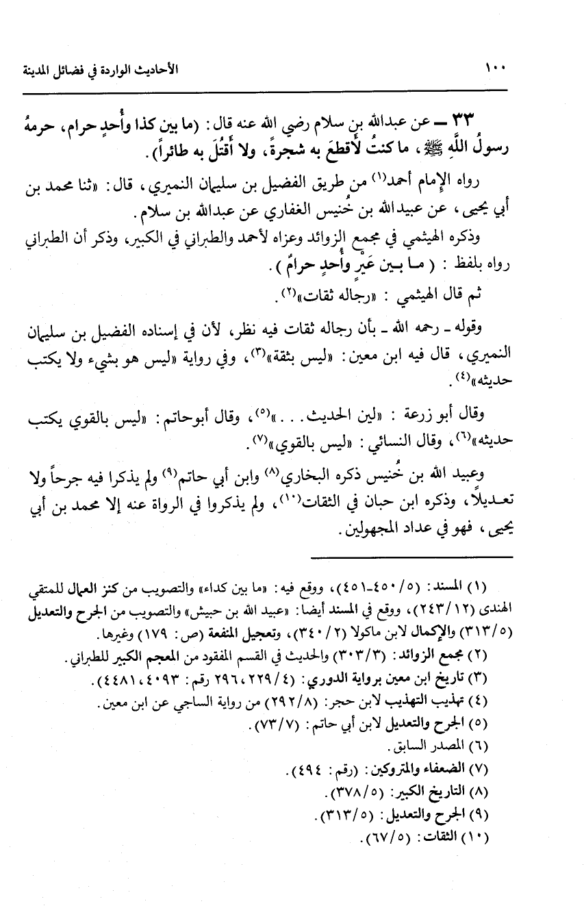 33 - عن عبد الله بن سلام رضي الله عنه قال: (ما بين كذا وكأحد حرام، حرمه رسول الله صلى الله عليه وسلم، ما كنت لاقطع به شجرة، ولا أقتل به طائرا).