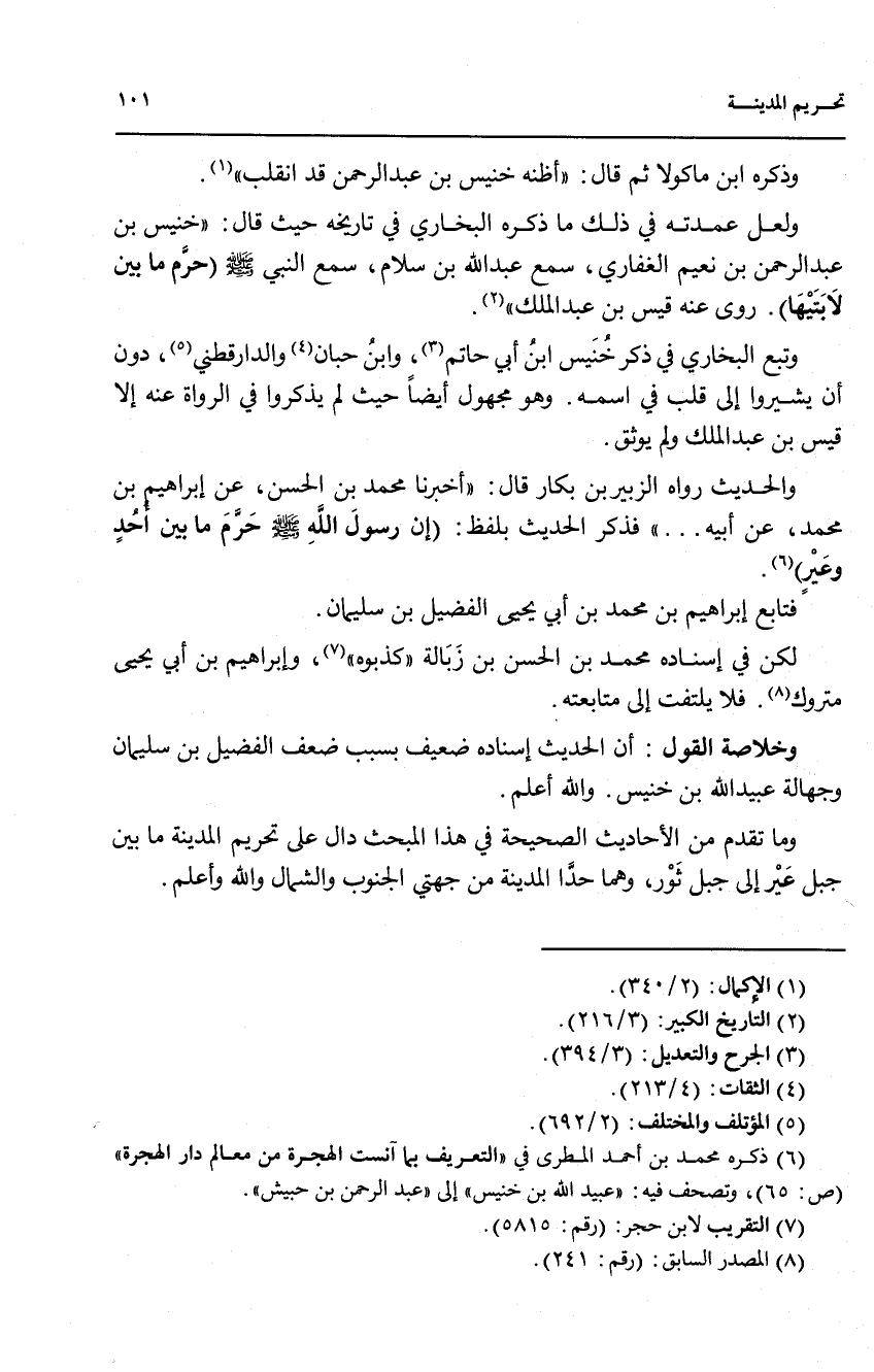 (6) ذكره محمد بن أحمد المطرى في ((التعريف بما آنست الهجرة من معالم دار الهجرة)) (ص: 65), وتصحف فيه: ((عبيد الله بن خنيس)) إلى ((عبد الرحمن بن حبيش)).