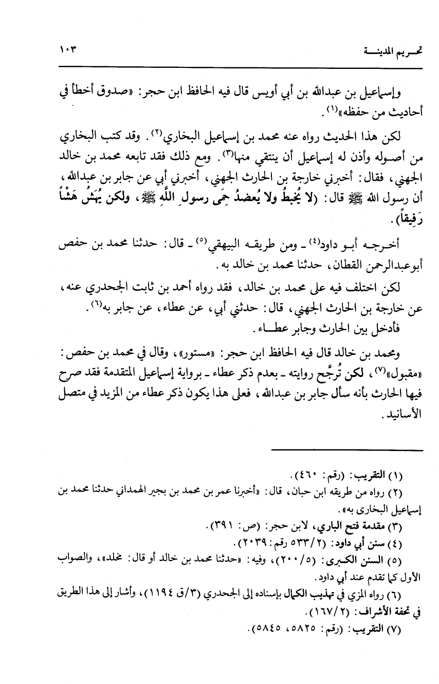 ومع ذلك فقد تابعه محمد بن خالد الجهني, فقال: أخبرني خارجة بن الحارث الجهني, أخبرني أبي عن جابر بن عبد الله, ان رسول الله صلى الله عليه وسلم قال: (لا يخبط زلا يعضد حمى رسول الله صلى الله عليه وسلم, ولكن يهش هشا رفيقا).