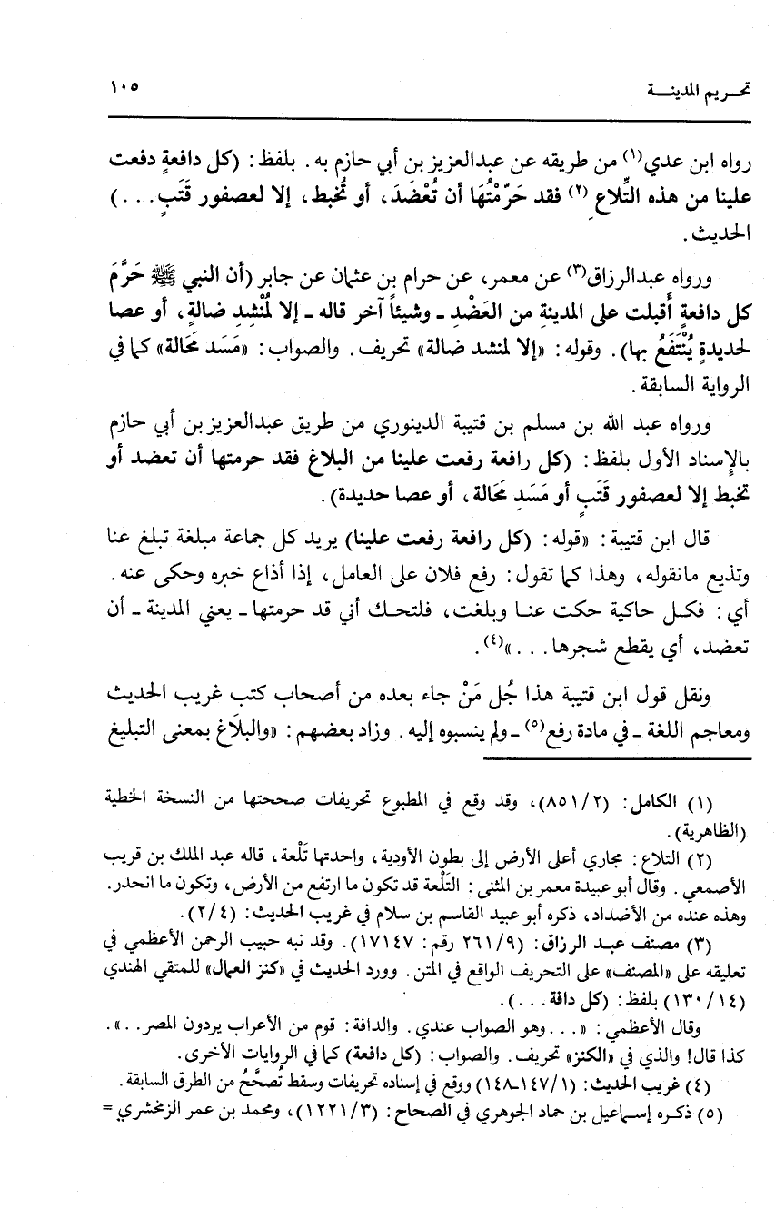 (3) مصنف عبد الرزاق: (261/ 9 رقم: 17147) وقد نبه حبيب الرحمن الأعظمي في تعليقه على ((المصنف)) على التحريف الواقع في المتن. وورد الحديث في ((كنز العمال)) للمتقي الهندي (130/ 14) بلفظ: (كل دافة ... ). وقال الأعظمي: (( ... وهو الصواب عندي. والدافة: قوم من الأعراب يردون المصر .... )). كذا قال! والذي في ((الكنز)) تحريف. والصواب: (كل دافعة) كما في الروايات الأخرى.