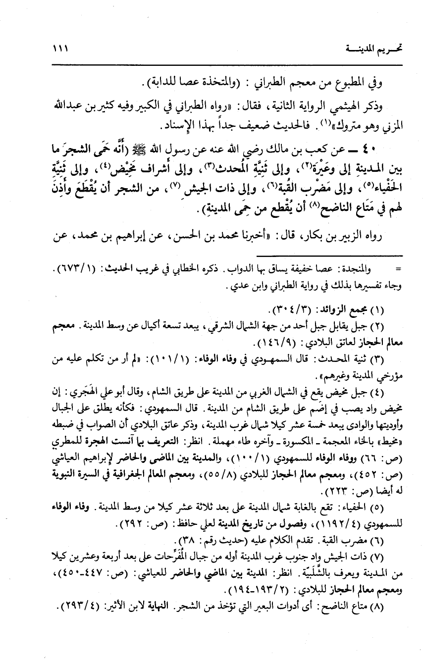40 - عن كعب بن مالك رضي لله عنه عن رسول الله صلى الله عليه وسلم (أنه حمى الشجر ما بين المدينة إلى وعيره (2)، وإلى ثنية المحدث (3)، وإلى أشراف مخيض (4)، وإلى ثنية الحفياء (5)، وإلى مضرب القبة (6) وإلى ذات الجيش (7)، من الشجر أن يقطع وأذن لهم في متاع الناضح (8) أن يقطع من حمى المدينة).