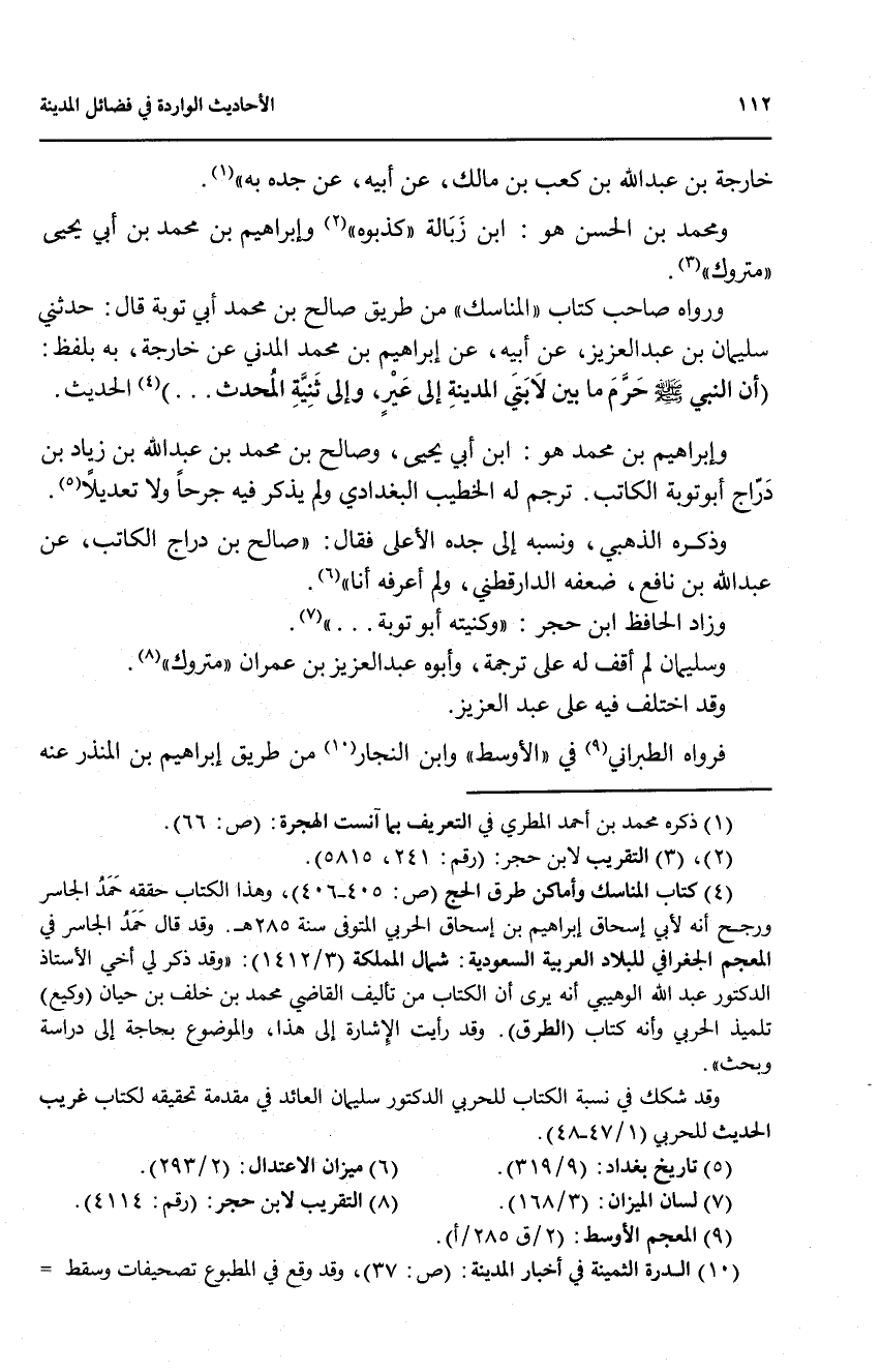 ورواه صاحب كتاب ((المناسك)) من طريق صالح بن محمد أبي توبة قال: حدثني سليمان بن عبد العزيز، عن أبيه، عن إبراهيم بن محمد المدني عن خارجه، به بلفظ: (أن النبي صلى الله عليه وسلم حرم ما بين لابتي المدينة إلى عير، وإلى ثنية المحدث ... ) (4) الحديث.