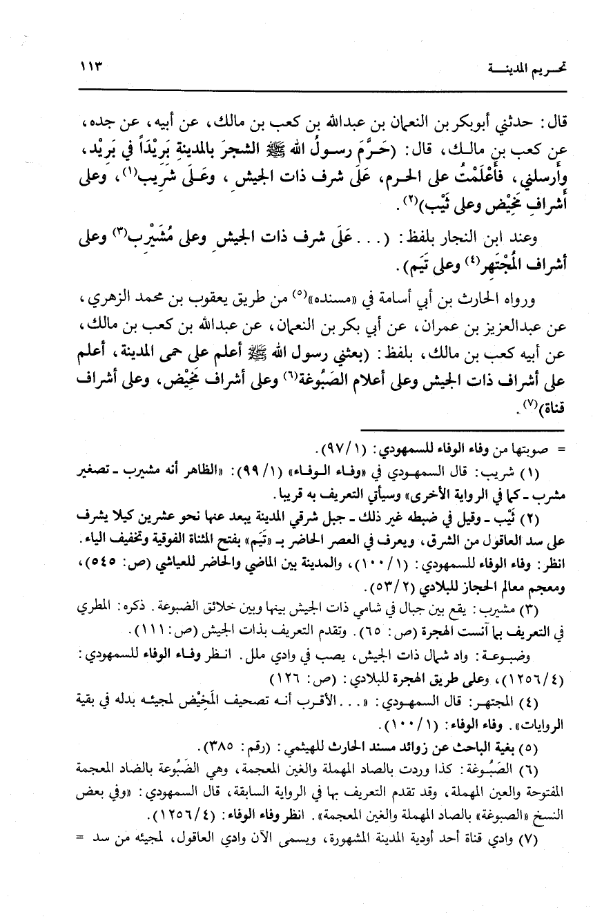 قال: حدثني أبو بكر بن النعمان بن عبد الله بن كعب بن مالك، عن أبيه، عن جده، عن كعب بن مالك، قال: (حرم رسول الله صلى الله عليه وسلم الشجر بالمدينة بريداً في بريد وأرسلني، فأعلمت على الحرم، على شرف ذات الجيش، وعلى شريب (1)، وعلى اشراف مخيض وعلى ثيب) (2).