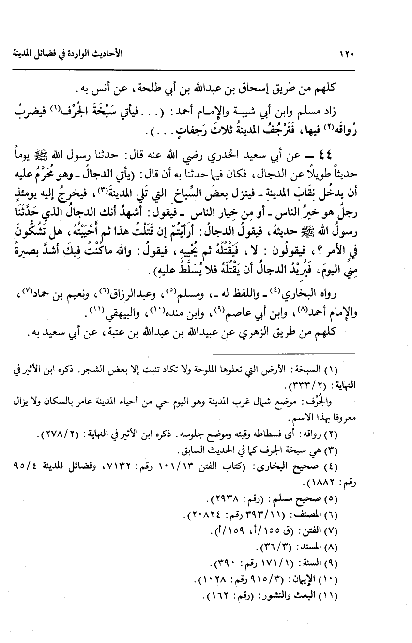 (1) السبخة: الارض التي تعلوها الملوحة ولا تكاد تنبت الا بعض الشجر، ذكره ابن الاثير في النهاية: (333/ 2). والجرف: موضع شمال غرب المدينة وهو اليوم حي من أحياء المدينة عامر بالسكان ولا يزال معروفا بهذا الاسم.
