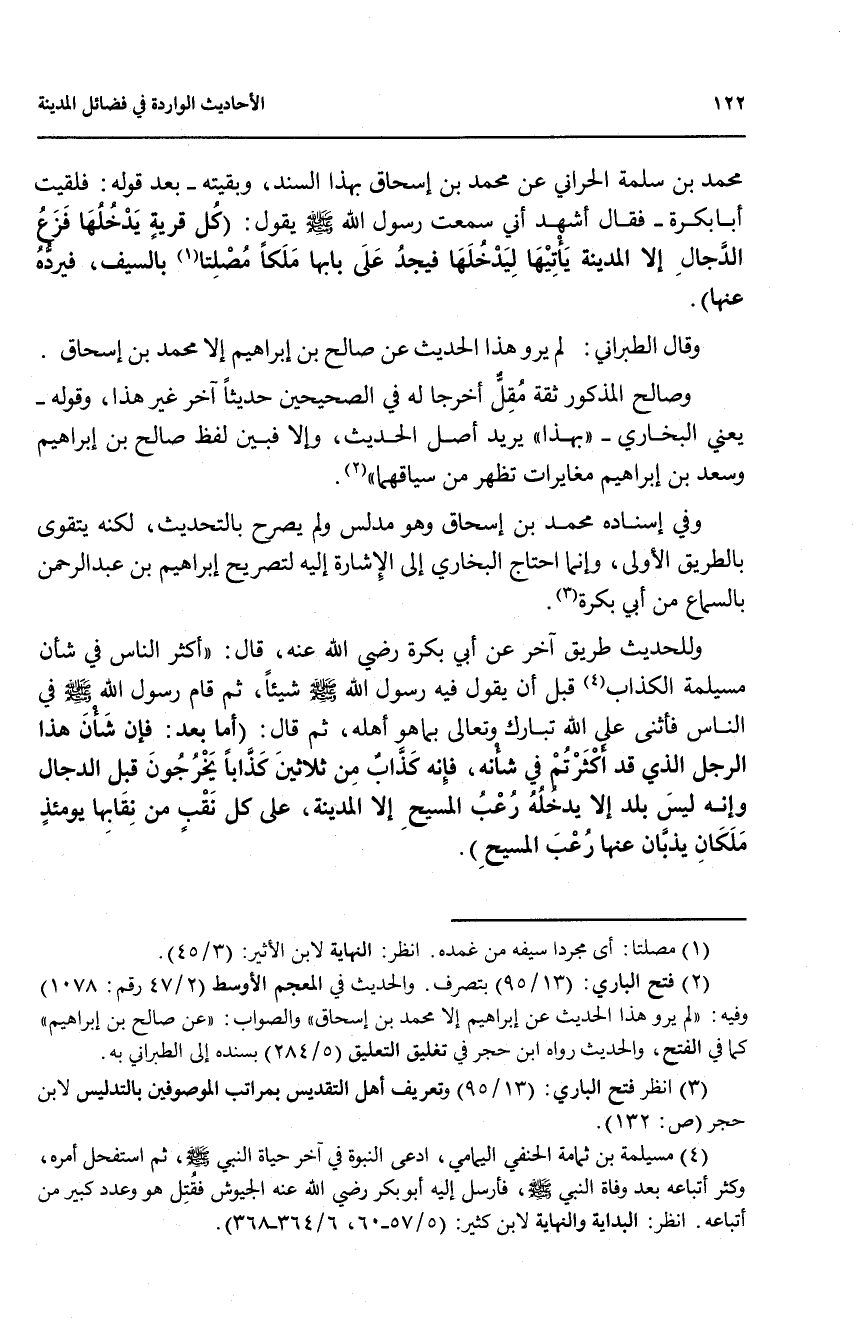 (2) فتح الباري: (95/ 13) بتصرف. والحديث في المعجم الأوسط (47/ 2 رقم: 1078) وفيه: ((لم يرو هذا الحديث عن إبراهيم إلا محمد بن إسحاق)) والصواب: ((عن صالح بن إبراهيم)) كما في الفتح، والحديث رواه ابن حجر في تغليق التعليق (284/ 5) بسنده إلى الطبراني به.