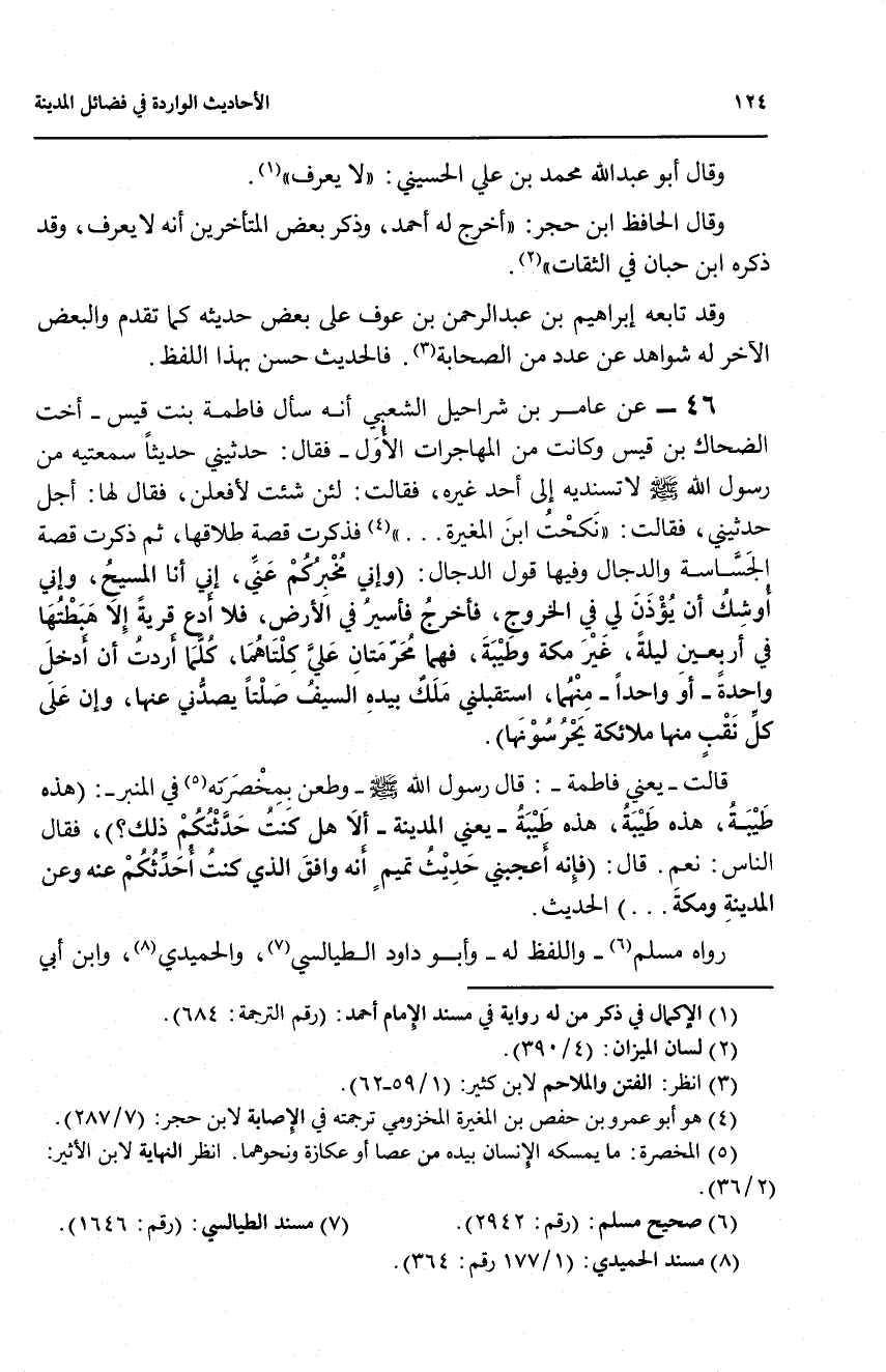 46 - عن عامر بن شراحيل الشعبي أنه سأل فاطمة بنت قيس - أخت الضحاك بن قيس وكانت من المهاجرات الأول - فقال: حدثني حديثاً سمعتيه من رسول الله صلى الله عليه وسلم لا تسنديه إلى أحد غيره، فقالت: لئن شئت لأفعلن، فقال لها: أجل حدثيني، فقالت: ((نكحت ابن المغيرة ... )) (4) فذكرت قصة طلاقها، ثم ذكرت قصة الجساسة والدجال وفيها قول الدجال: (واني مخبركم عني، اني أنا المسيح، وإني أوشك أن يؤذن لي في الخروج، فأخرج فأسير في الأرض، فلا أدع قرية الا هبطتها في أربعين ليلة، غير مكة وطيبة، فهما محرمتان علي كلتاهما، كلما أردت أن أدخل واحدة - أو واحداً - منهما، استقبلني ملك بيده السيف صلتا يصدني عنها، وإن على كل نقب منها ملائكة يحرسونها).
