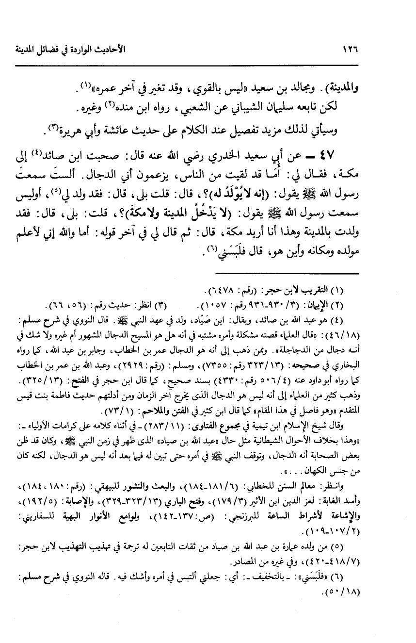 47 - عن أبي سعيد الخدري رضي الله عنه قال: صحبت ابن صائد (4) إلى مكة، فقال لي: أما قد لقيت من الناس، يزعمون أني الدجال. ألست سمعت رسول الله صلى الله عليه وسلم يقول: (إنه لا يولد له)؟، قال: قلت بلى، قال: فقد ولد لي (5)، أو ليس سمعت رسول الله صلى الله عليه وسلم يقول: (لا يدخل المدينة ولا مكة)؟، قلت: بلى، قال: فقد ولدت بالمدينة وهذا أنا أريد مكة، قال: ثم قال لي في آخرقوله: أما والله إني لأعلم مولده ومكانه وأين هو، قال فلبسني (6).