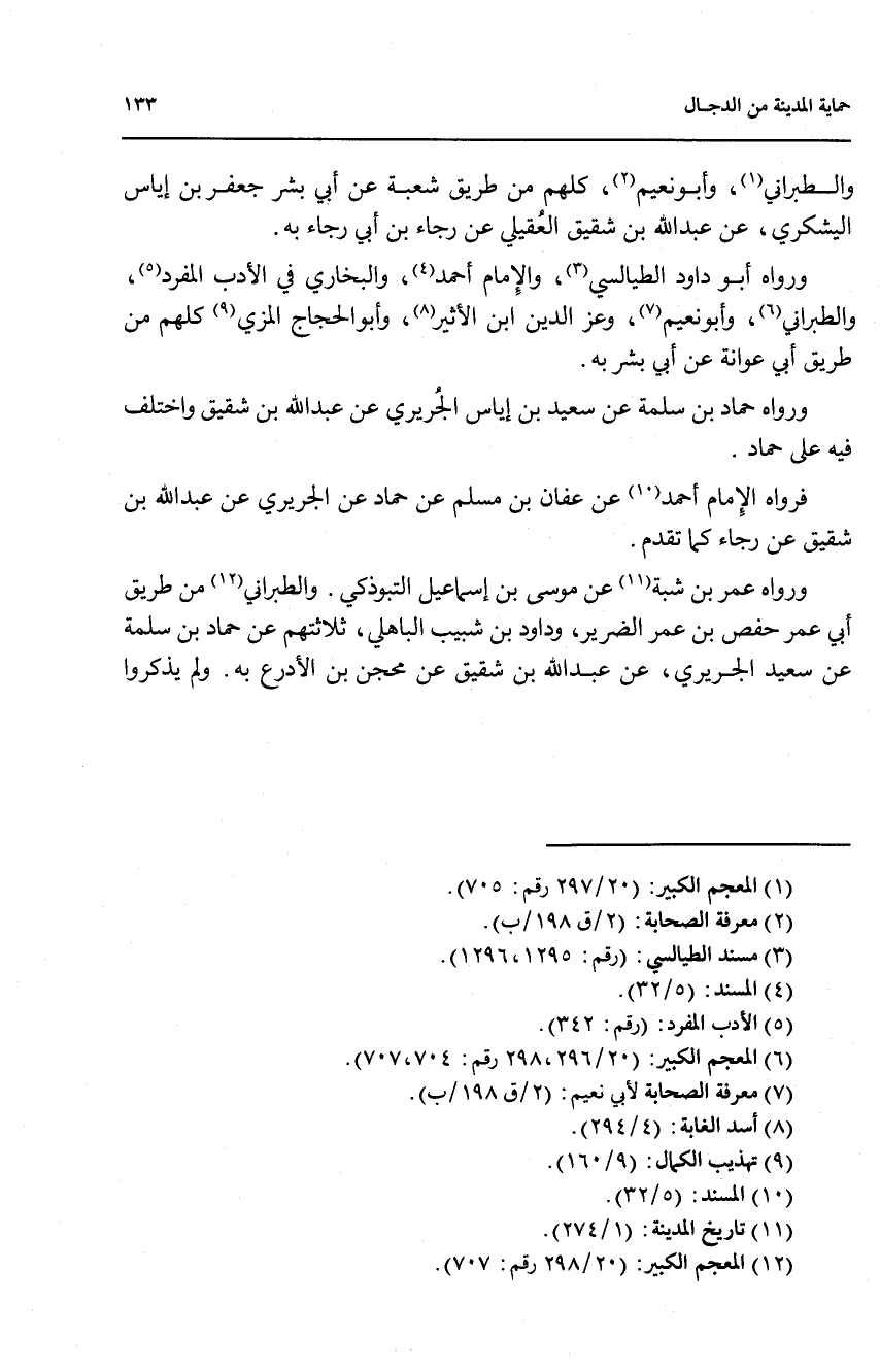 ورواه عمر بن شبة (11) عن موسى بن إسماعيل التبوذكي، والطبراني (12) من طريق أبي عمر حفص بن عمر الضرر، وداود بن شبيب الباهلي، ثلاثتهم عن حماد بن سلمة عن سعيد الخدري، عن عبد الله بن شقيق عن محجن بن الأدرع به.