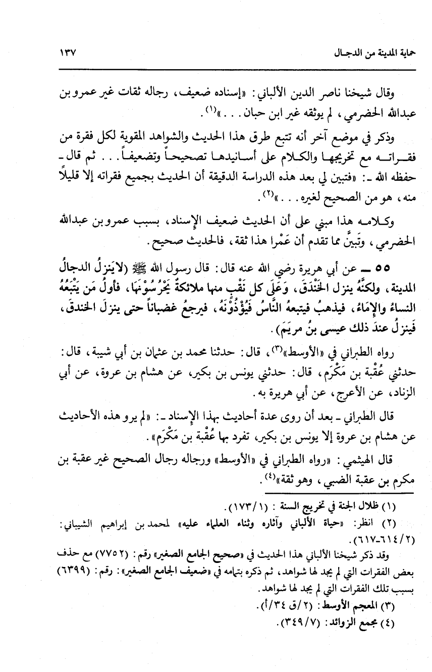 (2) انظر: ((حياة الألباني وآثاره وثناء العلماء عليه)) لمحمد بن إبراهيم الشيباني: (614/ 2 - 617). وقد ذكر شيخنا الألباني هذا الحديث في ((صحيح الجامع الصغير)) رقم: (7752) مع حذف بعض الفقرات التي لم يحد لها شواهد، ثم ذكره بتمامه في ((ضعيف الجامع الصغير)): رقم: (6399) بسبب تلك الفقرات التي لم يجد لها شواهد.