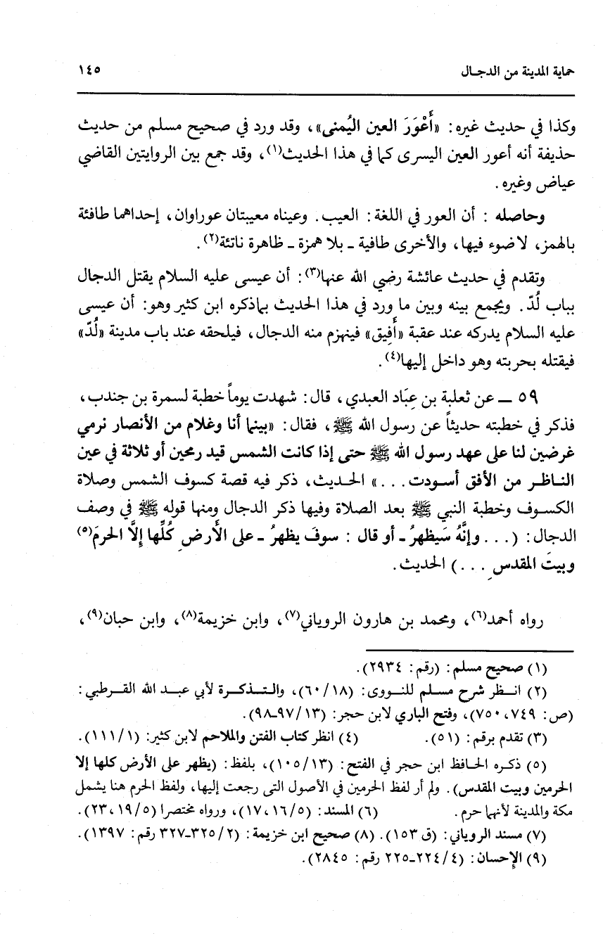 59 - عن ثعلبة بن عباد العبدي، قال: شهدت يوماً خطبة لسمرة بن جندب، فذكر في خطبته حديثاً عن رسول الله صلى الله عليه وسلم، فقال: ((بينما أنا وغلام من الأنصار نرمي غرضين لنا على عهد رسول الله صلى الله عليه وسلم حتى إذا كانت الشمس قيد رمحين أو ثلاثة في عين الناظر من الافق أسودت ... )) الحديث، ذكر فيه قصة كسوف الشمس وصلاة الكسوف وخطبة النبي صلى الله عليه وسلم بعد الصلاة وفيها ذكر الدجال ومنها قوله صلى الله عليه وسلم في وصف الدجال: ( ... وإنه سيظهر - أو قال: سوف يظهر - على الأرض كلها الا الحرم (5) وبيت المقدس .. ) الحديث.