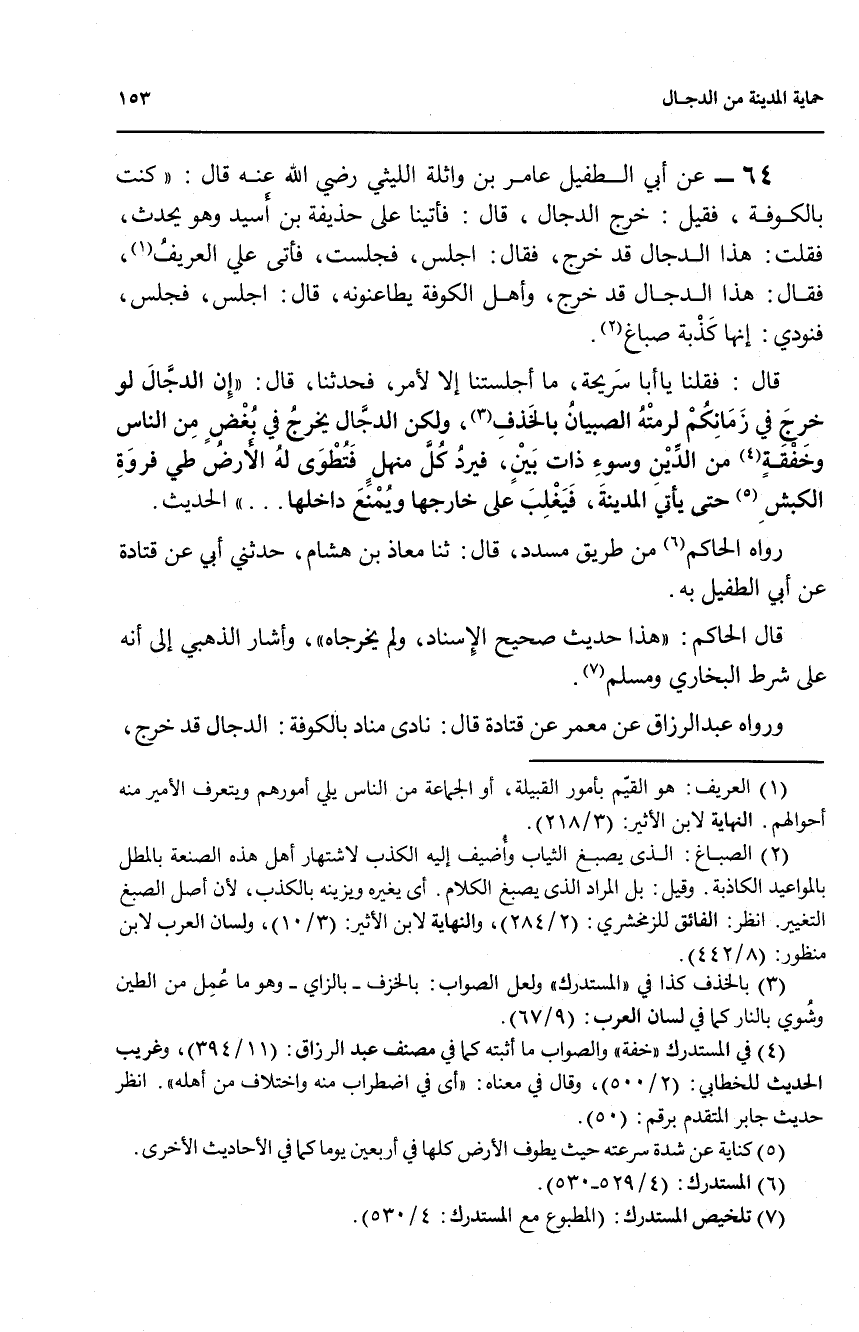 64 - عن أبي الطفيل عامر بن واثلة الليثي رضي الله عنه قال: ((كنت بالكوفة، فقيل: خرج الدجال، قال: فأتينا على حذيفة بن أسيد وهو يحدث، فقلت: هذا الدجال قد خرج، قال: الجس، فجلست، فأتى على العريف (1)، فقال: هذا الدجال قد خرج، وأهل الكوفة يطاعنونه: قال: اجلس، فجلس، فنودي: إنها كذبة صباغ (29.