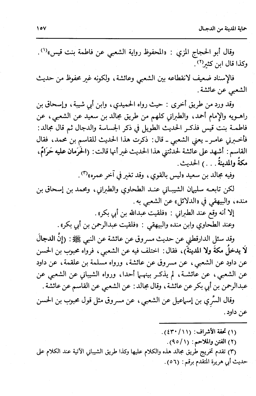 وقد سئل الدارقطني عن حديث مسروق عن عائشة عن النبي صلى الله عليه وسلم: (إن الدجال لا يدخل مكة ولا المدينة)، فقال: اختلف فيع عن الشعبي، فرواه محبوب بن الحسن عن داود عن الشعبي، عن مسروق عن عائشة، ورواه مسلمة بن علقمة، عن داود عن الشعبي، عن عائشة، لم يذكر بينهما أحدا، ورواه الشيباني عن الشعبي عن عبد الرحمن بن أبي بكر عن عائشة، وقال مجالد: عن الشعبي عن القاسم عن عائشة.