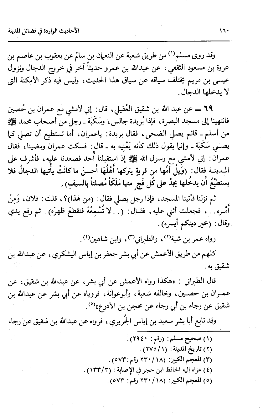 69 - عن عبد الله بن شقيق العقيلي، قال: إني لأمشي مع عمران بن حصين فانتيهنا إلى مسجد البصرة، فإذا بريدة جالس، وسكبة - رجل من أصحاب محمد صلى الله عليه وسلم من أسلم - قائم يصلي الضحى، فقال بريدة: يا عمران، أما تستطيع ان تصلي كما يصلي سكبة - وإنما يقول ذلك كأنه يعنيه به - قال: فسكت عمران ومضينا، فقال عمران: إن لأمشي مع رسول الله صلى الله عليه وسلم إذ استقبلنا أحد فصعدنا عليه، فأشرف على المدينة فقال: (ويل أمها من قرية يتركها أهلها احسن ما كانت يأتيها الدجال فلا يستطيع ان يدخلها يجد على كل فج منها ملكا مصلتاً بالسيف).