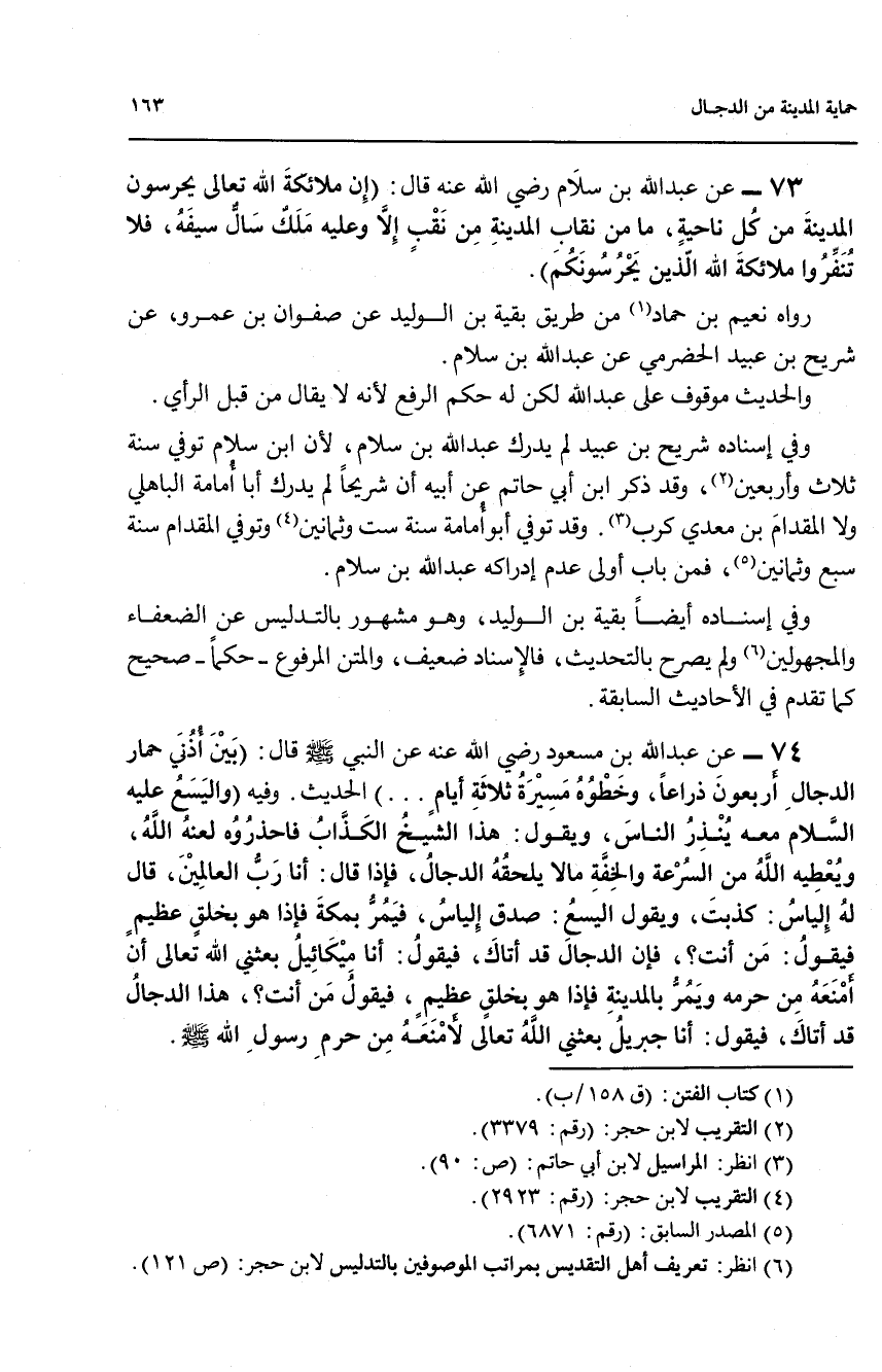 73 - عن عبد الله بن سلام رضي الله عنه قال: (إن ملائكة الله تعالى يحرسون المدينة من كل ناحية، ما من نقاب المدينة من نقب الا وعليه ملك سأل سيفه، فلا تنفروا ملائكة الله الذين يحرسونكم).