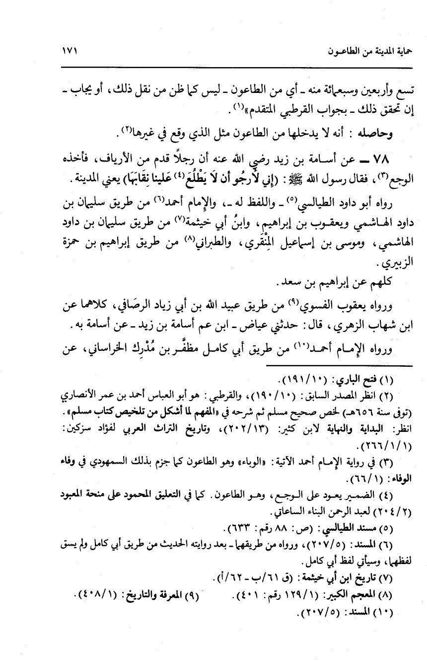 78 - عن أسامة بن زيد رضي الله عنه أن رجلاً قدم من الأرياف، فأخذه الوجع (3)، فقال رسول الله صلى الله عليه وسلم: (إني لأرجو أن لا يطلع (4) علينا نقابها) يعني المدينة.