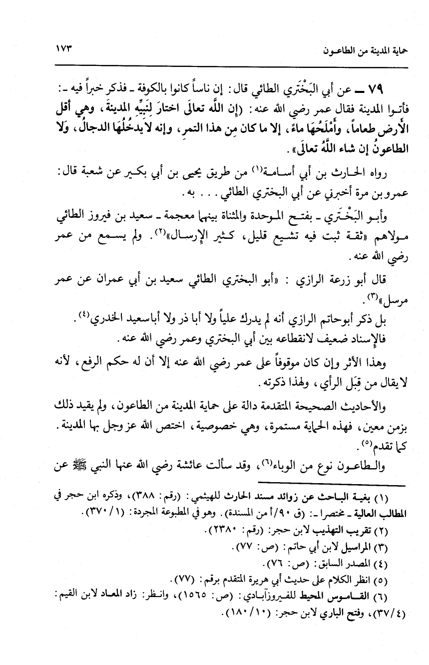 79 - عن أبي البحتري الطائي قال: إن ناساً كانوا بالكوفة - فذكر خبراً فيه -: فأتوا المدينة فقال عمر رضي الله عنه: (إن الله تعالى اختار لنبيه المدينة، وهي أقل الأرض طعاماً، وأملحها ماءً، الا ما كان من هذا التمر، وإنه لا يدخلها الدجال، ولا الطاعون إن شاء الله تعالى)).