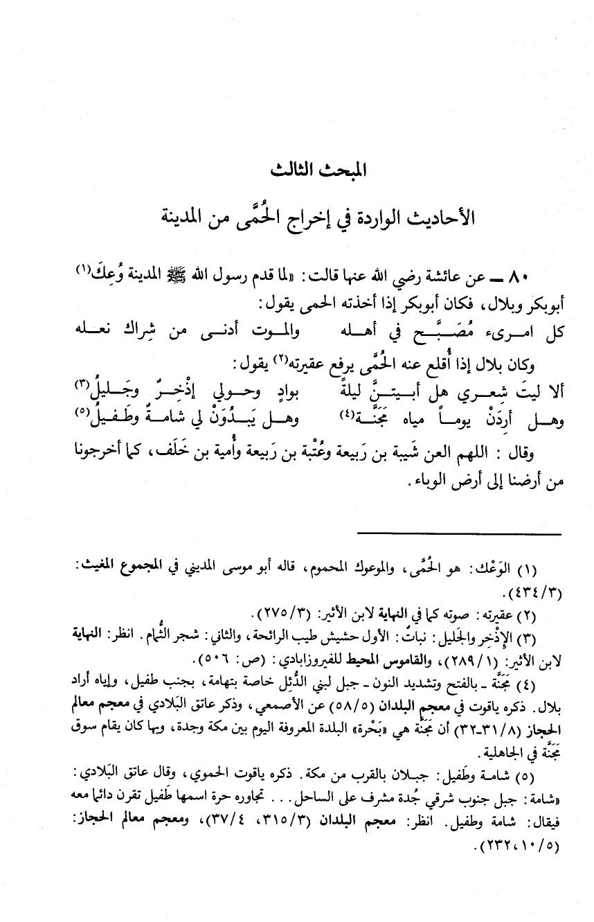 80 - عن عائشة رضي الله عنها قالت: ((لما قدم رسول الله صلى الله عليه وسلم المدينة وعك (1) أبو بكر وبلال، فكان أبو بكر إذا أخذته الحمى يقول: كل امرئ مصبح في أهله والموت أدنى من شراك نعله وكان بلال إذا أقلع عنه الحمى يرفع عقيرته (2) يقول: ألا ليت شعري هل أبيتن ليلة بواد وحولي إذخر وجليل (3) وهل أردن يوماً مياه مجنة (4) وهل يبدون لي شامة وطفيل (5) وقال: اللهم العن شيبة بن ربيعة وعتبة بن ربيعة وأمية بن خلف، كما أخرجونا من أرضنا إلى أرض الوباء.