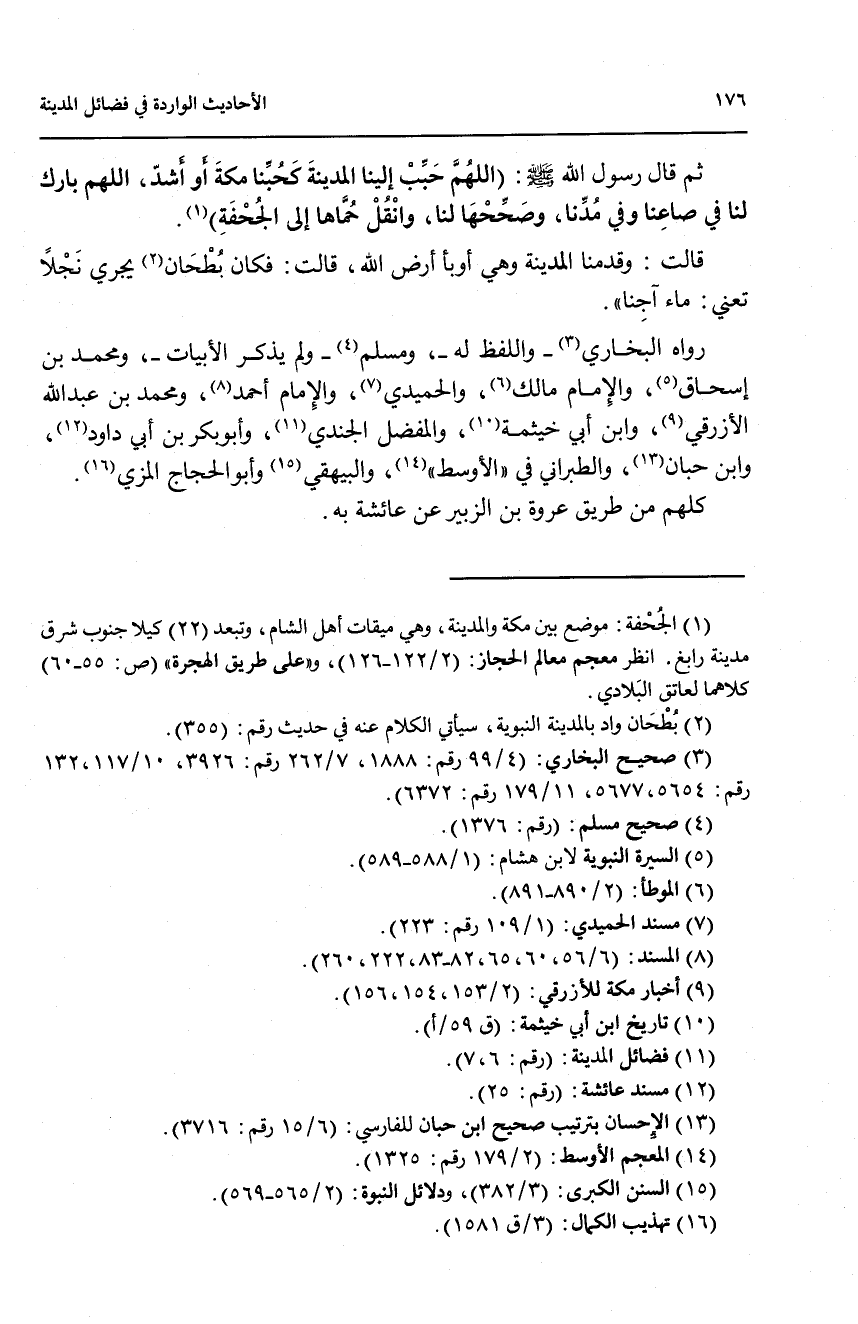 ثم قال رسول الله صلى الله عليه وسلم: ((اللهم حبب إلينا المدينة كحبنا مكة أو أشد، اللهم بارك لنا في صاعنا وفي مدنا، وصححها لنا، وانقل حماها إلى الجحفة) (1).