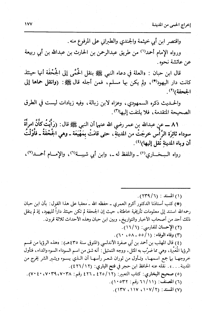 (*) كتب أستاذنا الدكتور أكرم العمري - حفظه الله - معقبا على هذا القول: بأن ابن حبان رحمه الله أستند إلى معلومات تاريخية خاطئة، حيث أن الجحفة لم تكن حينئذ داراً لليهود، إذ ل ينقل ذلك أحد من اصحاب الاخبار والتواريخ، وبين ابن حبان وهذه الأحاديث ثلاثة قرون.