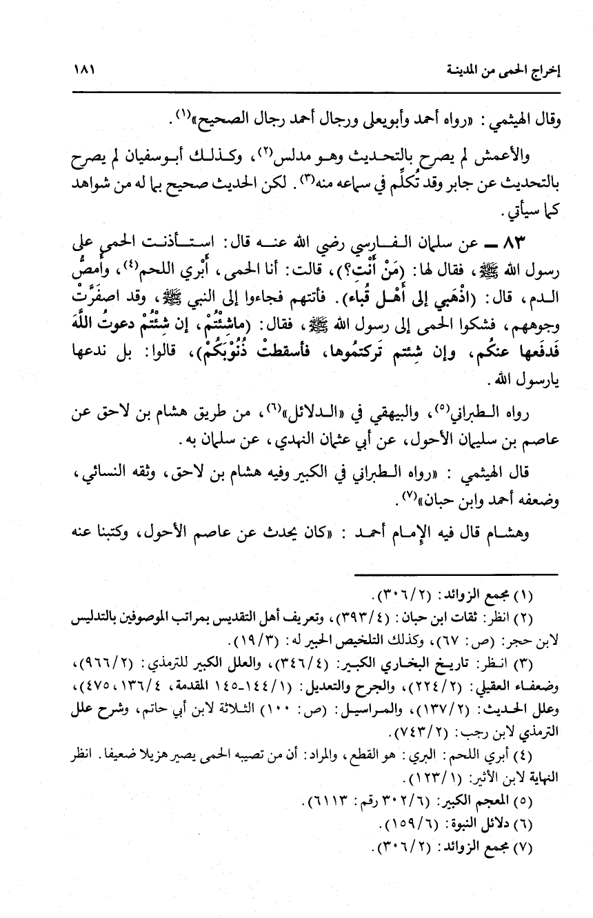83 - عن سلمان الفارسي رضي الله عنه قال: استأذنت الحمى على رسول الله صلى الله عليه وسلم، فقال لها: (من أنت؟)، قالت: أنا الحمى، أبري اللحم (4)، وأمص الدم، قال (اذهبي إلى أهل قباء).