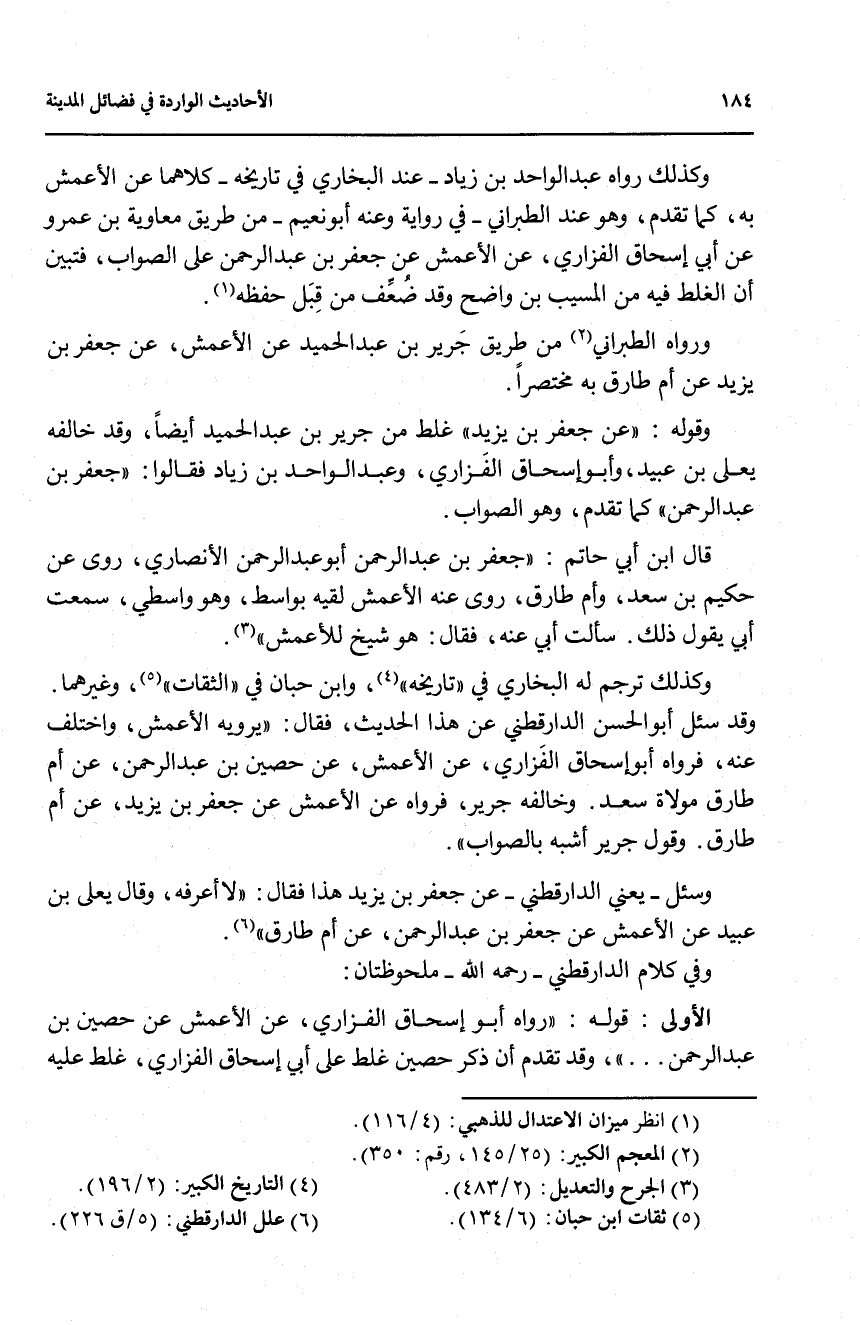 سألت أبي عنه، فقال: هو شيخ للأعمش)) (3) وكذلك ترجم له البخاري في ((تاريخه)) (4)، وابن حبان في ((الثقات)) (5)، وغيرهما وقد سئل أبو الحسن الدارقطني عن هذا الحدث، فقال: ((يرويه الأعمش، واختلف عنه، فرواه أبو إسحاق الفزاري، عن الأعمش، عن حصين بن عبد الرحمن، عن أم طارق مولاة سعد. وخالفه جرير، فرواه عن الأعمش عن جعفر بن يزيد، عن أم طارق. وقول جرير أشبه بالصواب)).